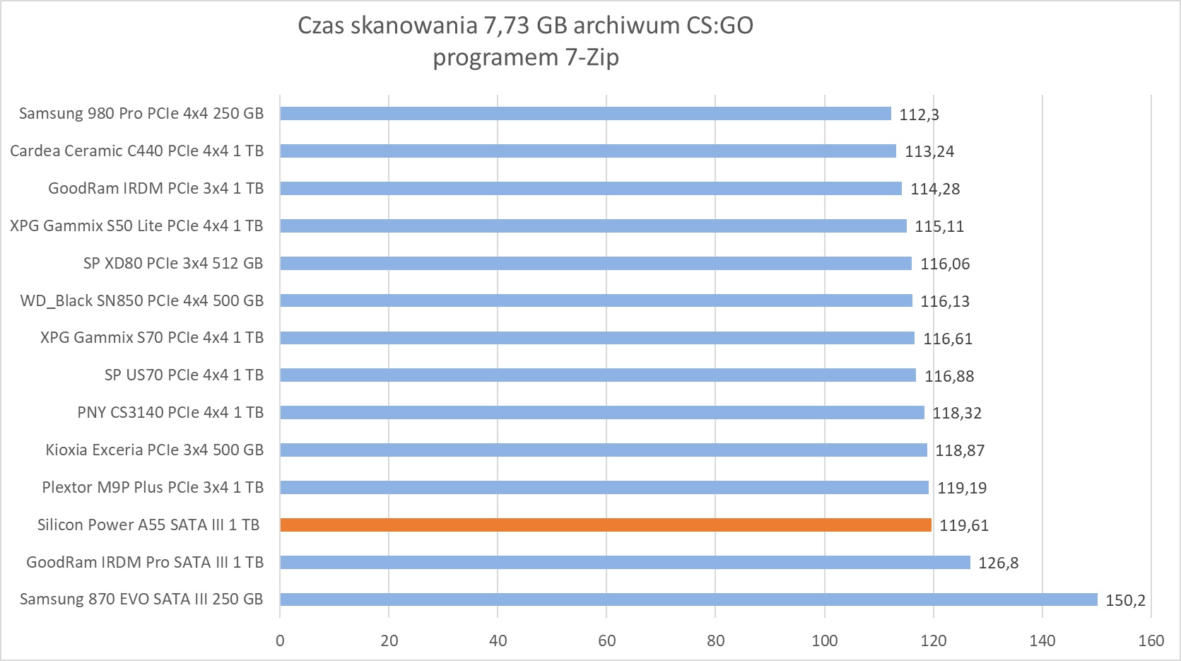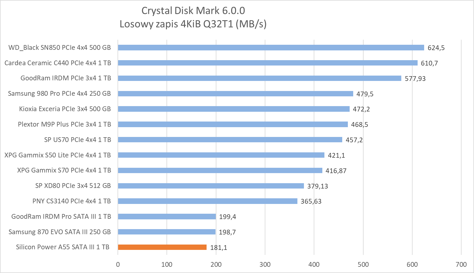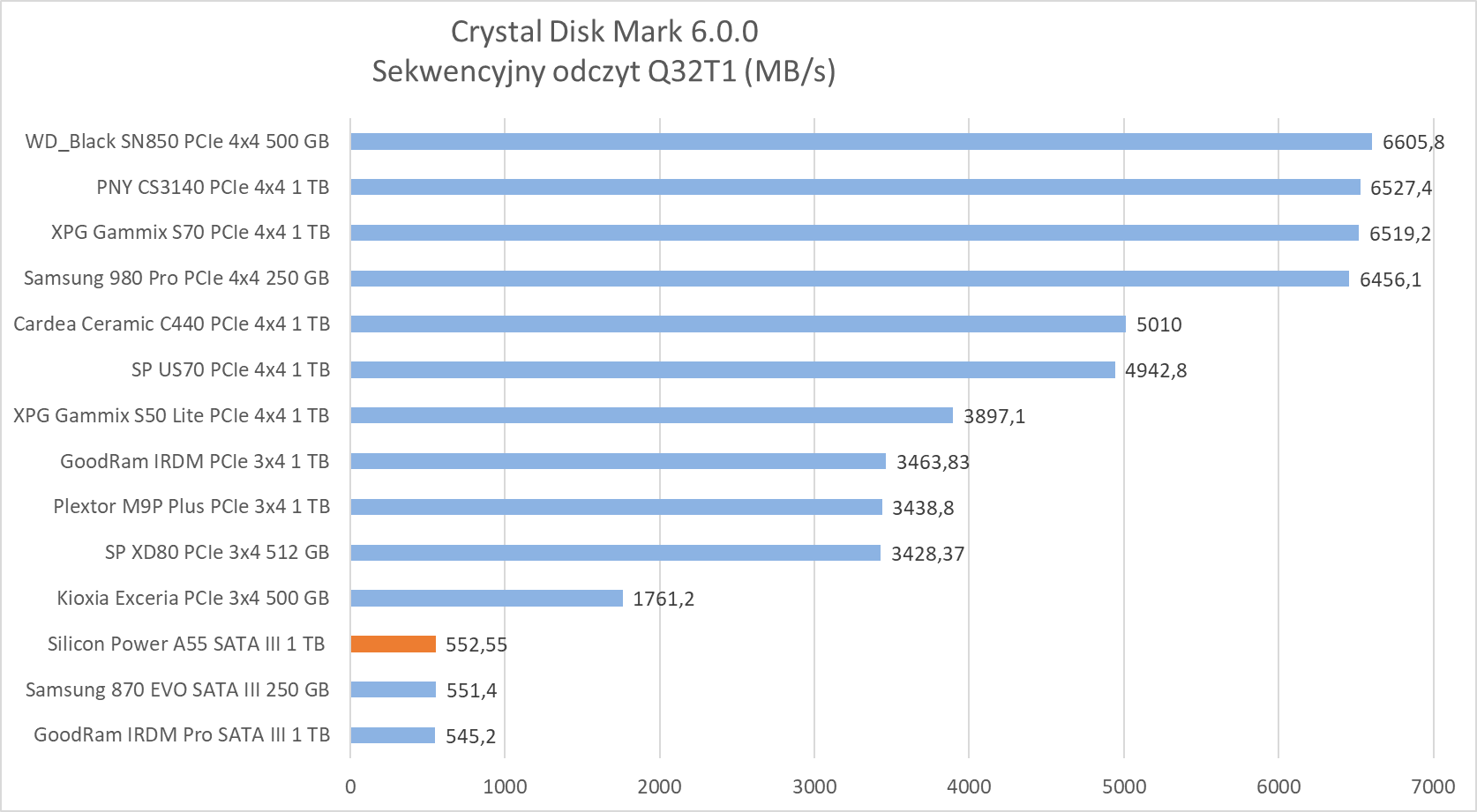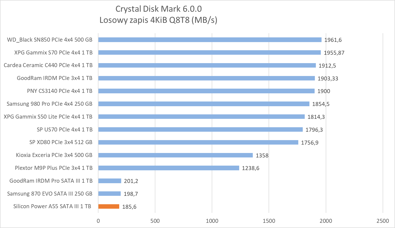 Jako że w naszej bazie nie ma zbyt wielu dysków na SATA III, bo są jedynie dwa, to Silicon Power A55 ma w teorii ułatwione zadanie. Jednak może się tak wydawać tylko z pozoru, bo tak naprawdę ten nośnik walczy tutaj z renomowanym dyskiem giganta, czyli Samsungiem 870 Evo oraz polskim producentem GoodRAM IRDM Pro. Warto jednak zauważyć różnice w pojemności, bo poniżej przedstawiamy wyniki testów najwydajniejszej wersji 1 TB, pozostawiając porównanie mniej pojemnych modeli na później.