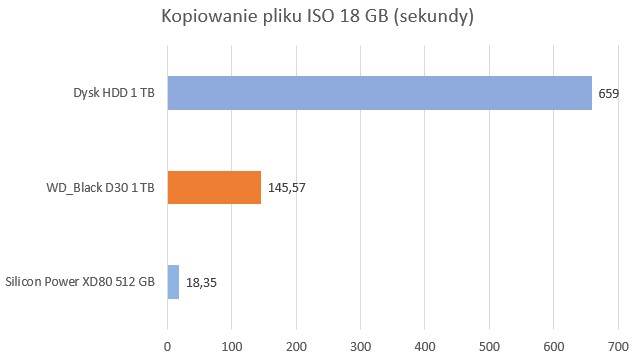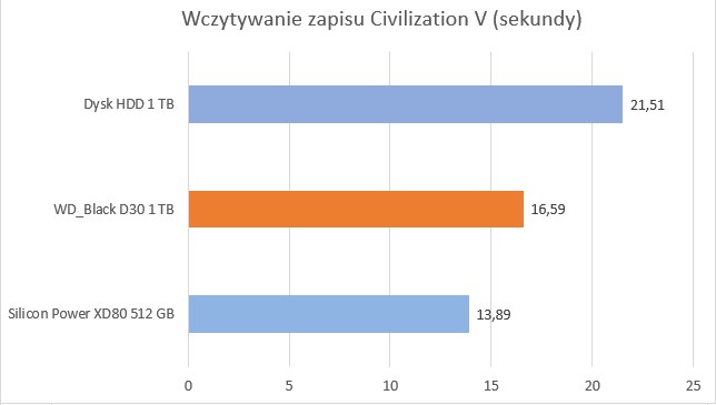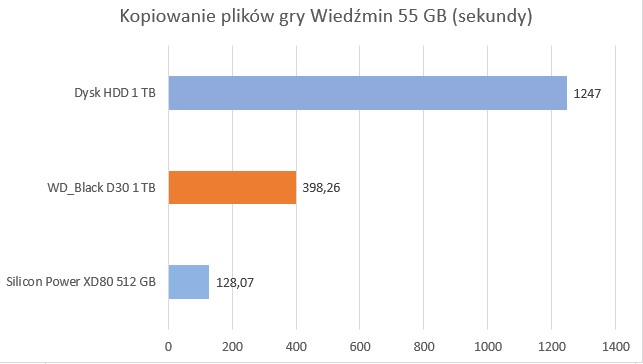 Nic jednak w tym dziwnego, bo WD Black D30 powstał po to, aby przechowywać gry na konsolach. W tym sprawdza się świetnie, bo choć czas kopiowania wydłuża się znacząco względem pełnoprawnego SSD na PCIe 3.0, to czasy ładowania gier są już zbliżone. Dlatego też dysk wydaje się wybawieniem dla posiadaczy starych konsol (tam znajdziemy wolne HDD) i tych, którzy, choć mają nowe konsole, to miejsce na ich wbudowanych dyskach SSD okazało się niewystarczające.