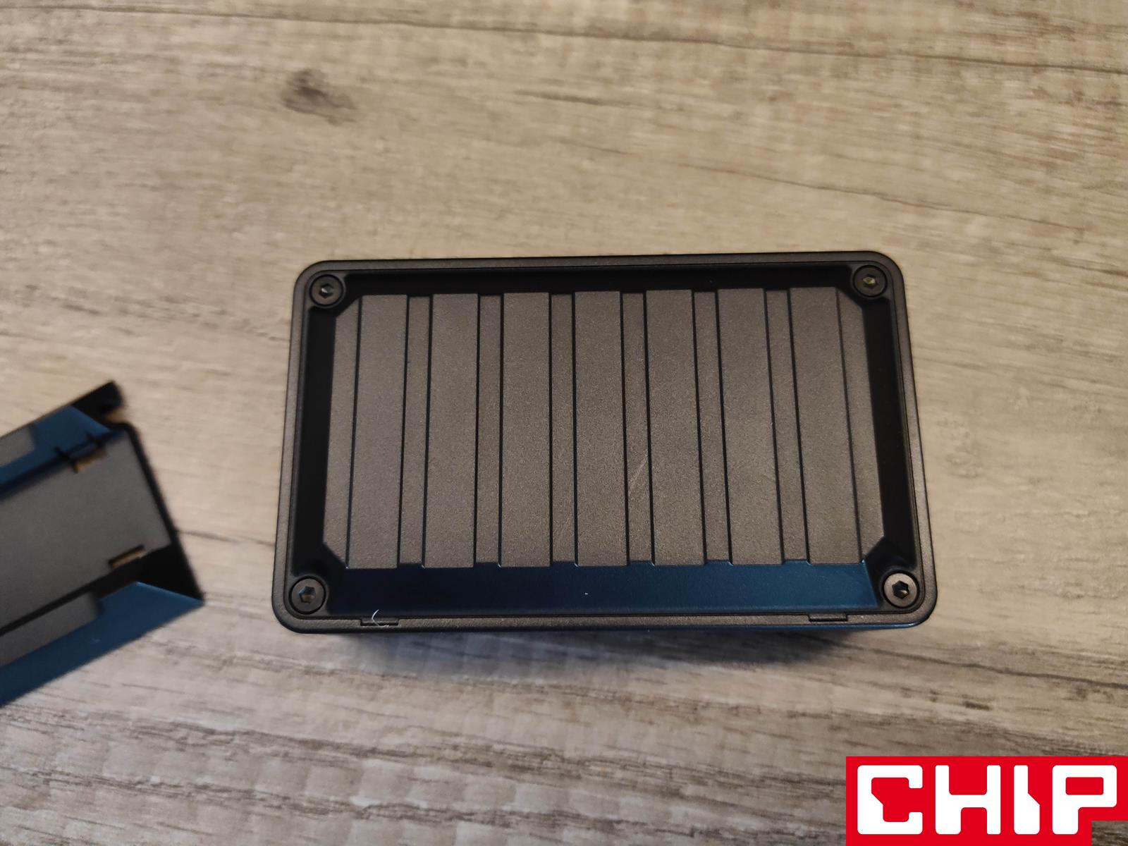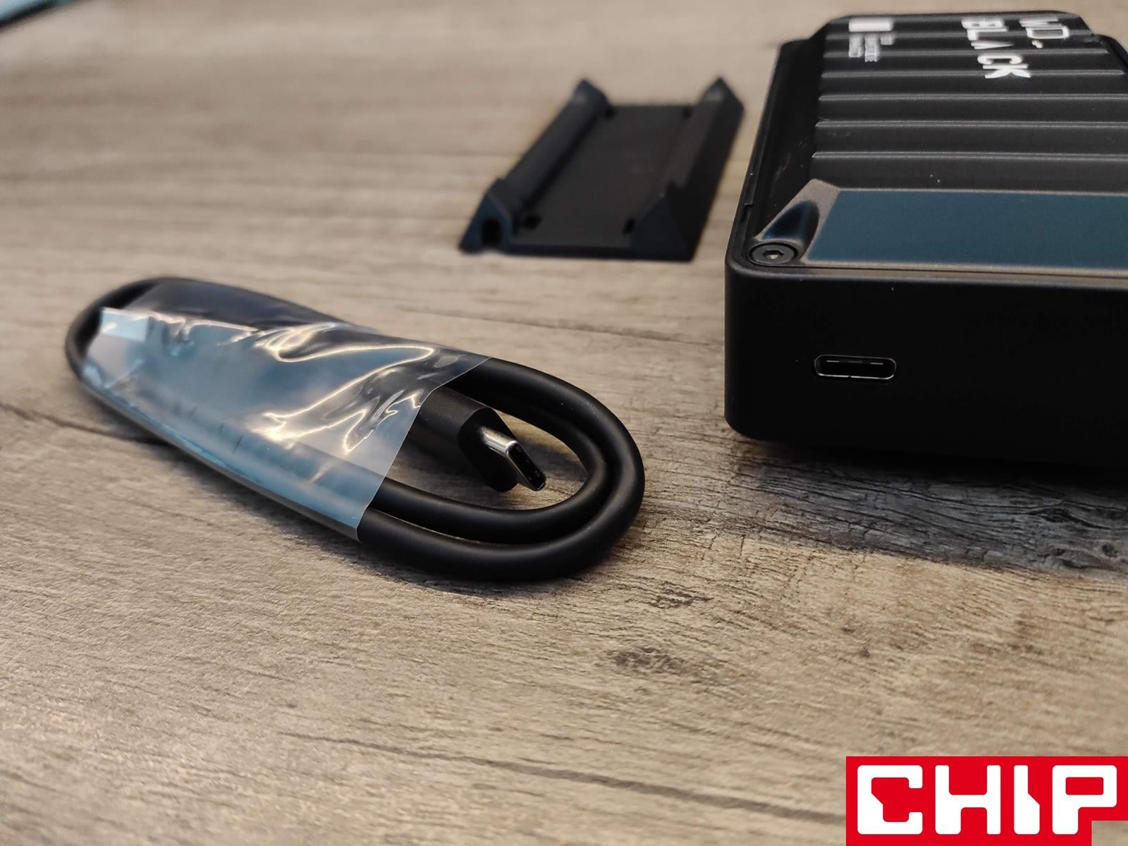 Już na samym początku pozytywne wrażenia czerpiemy nawet z samego unboxingu tego zewnętrznego dysku. Minimalistyczny, elegancki czarny karton okraszony mieniącymi się kropeczkami, renderami oraz najważniejszymi informacjami, sprawia wrażenie sprzętu z górnej półki. To wrażenie kontynuuje wnętrze, gdzie w plastikowym, dwuczęściowym etui znajdziemy nie tylko sam dysk, ale też podstawkę, instrukcję obsługi, kartę informacyjną oraz prawie 50-centymetrowy przewód USB-C do USB-A.