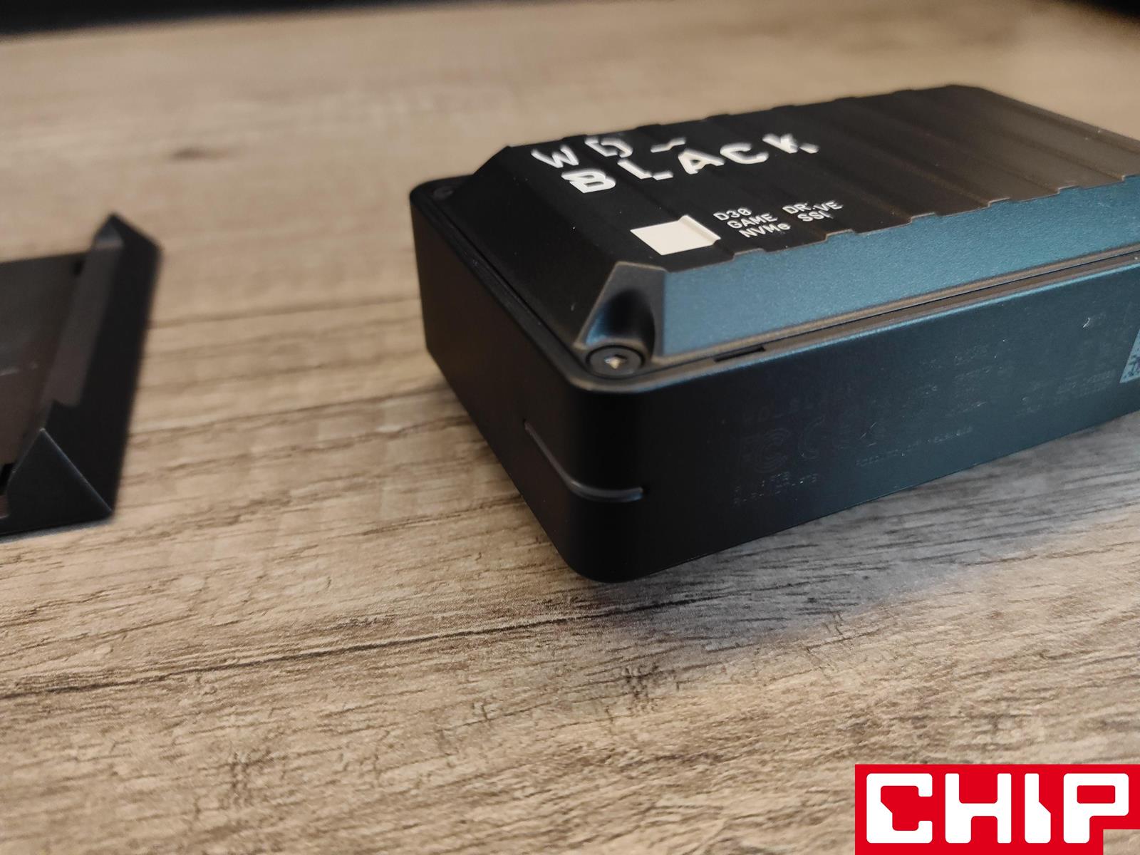 WD Black D30 bez podstawki waży 125 gramów i mierzy 96 x 35 x 58 mm, a więc niewiele, mieszcząc się bez problemu w dłoni. Dołączona w zestawie podstawka, pozwala lepiej wyeksponować dysk obok konsoli i chroni jednocześnie meble przed rysami swoimi gumowymi podkładkami. Z fizycznych aspektów warto jeszcze wyróżnić białą diodę informacyjną na boku obudowy oraz cztery śrubki, chroniące wnętrze dysku.