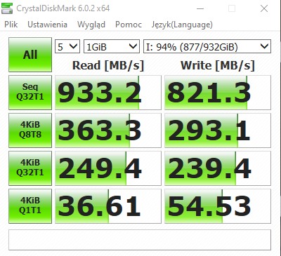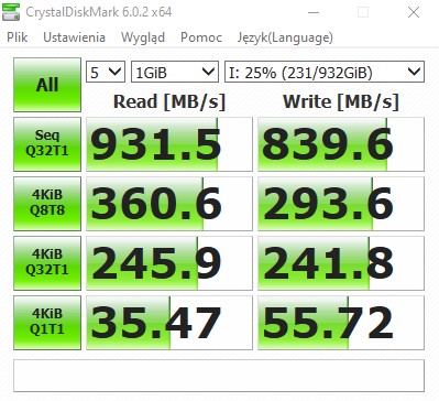 Test przeprowadziłem z wykorzystaniem płyty głównej ASRock Extreme4 X570 z procesorem Ryzen 5 3600X i dwoma 8-gigabajtowymi modułami HyperX Fury 2133 MHz. Jako że to dysk z myślą o graniu, to skupiłem się poniżej właśnie na tym, jak jego możliwości spiszą się w porównaniu do innych dysków. Najpierw jednak rzućcie okiem na wynik jego szybkości uzyskany w tradycyjnym benchmarku i zapiszcie gdzie sobie z tyłu głowy, że w wersji 1 TB oferuje nie 1024, a 931 GB wolnej przestrzeni.