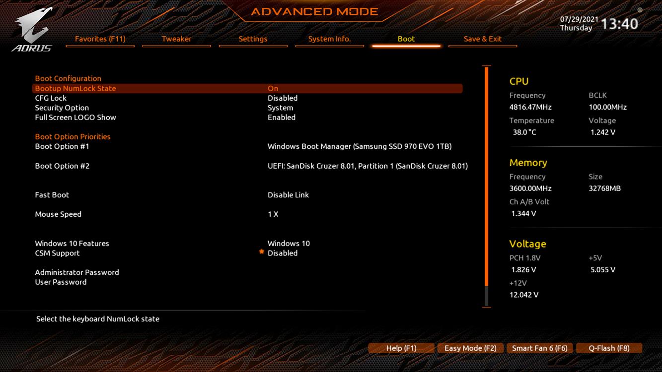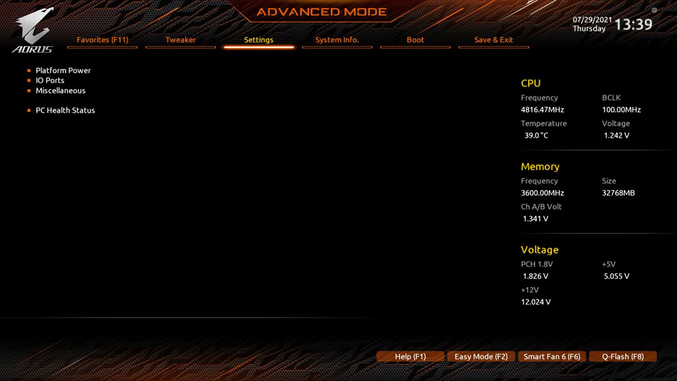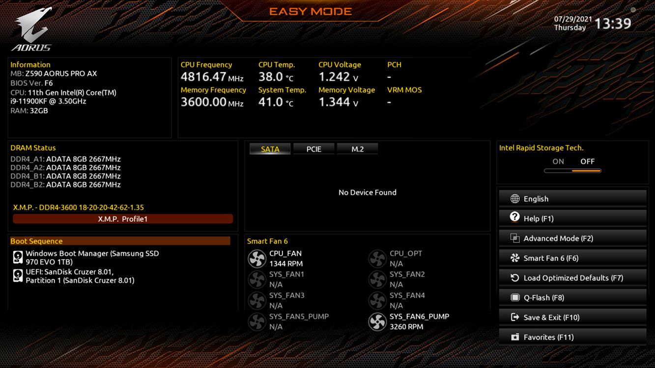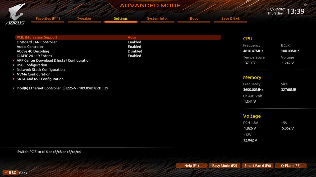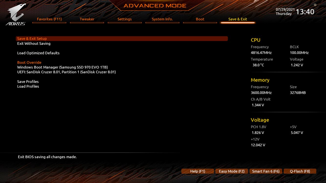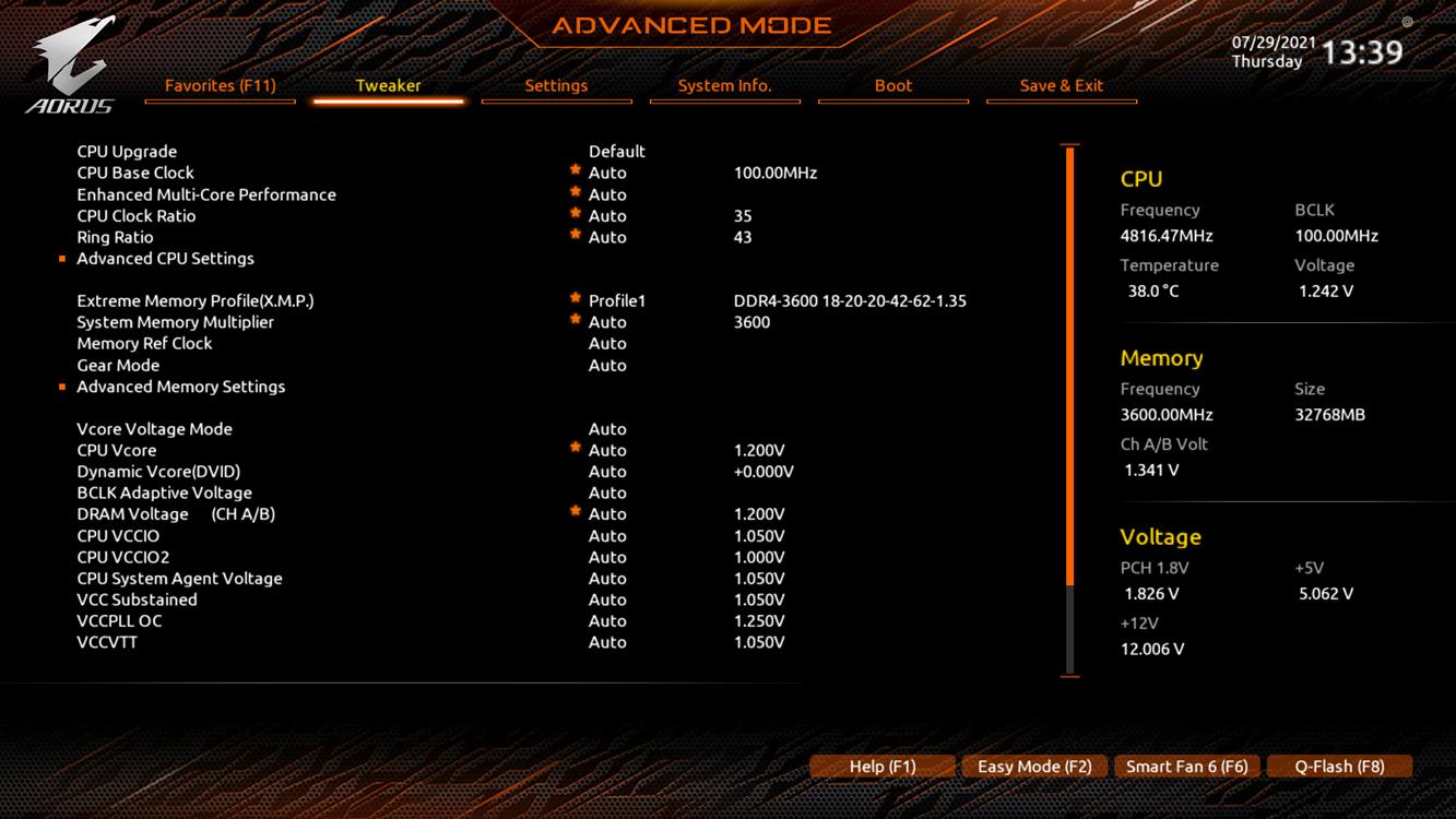 Testy przeprowadziłem na BIOSie F6, który był najnowszym w momencie ich wykonywania. Płyta działa przy domyślnych ustawieniach, jedynie włączyłem profil XMP pamięci. Z590 Aorus Pro AX prawidłowo wykrył pamięci i ustawił dla nich Gear 1. Procesor w wielordzeniowych testach Cinebench R23 boostował do 4,8 GHz.