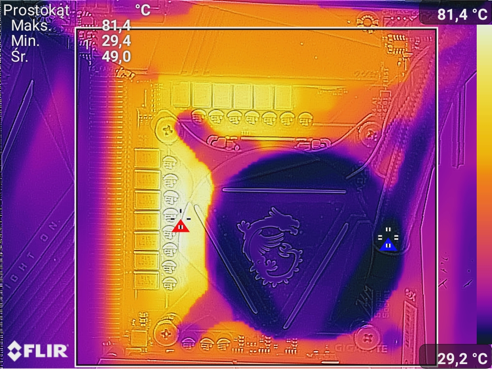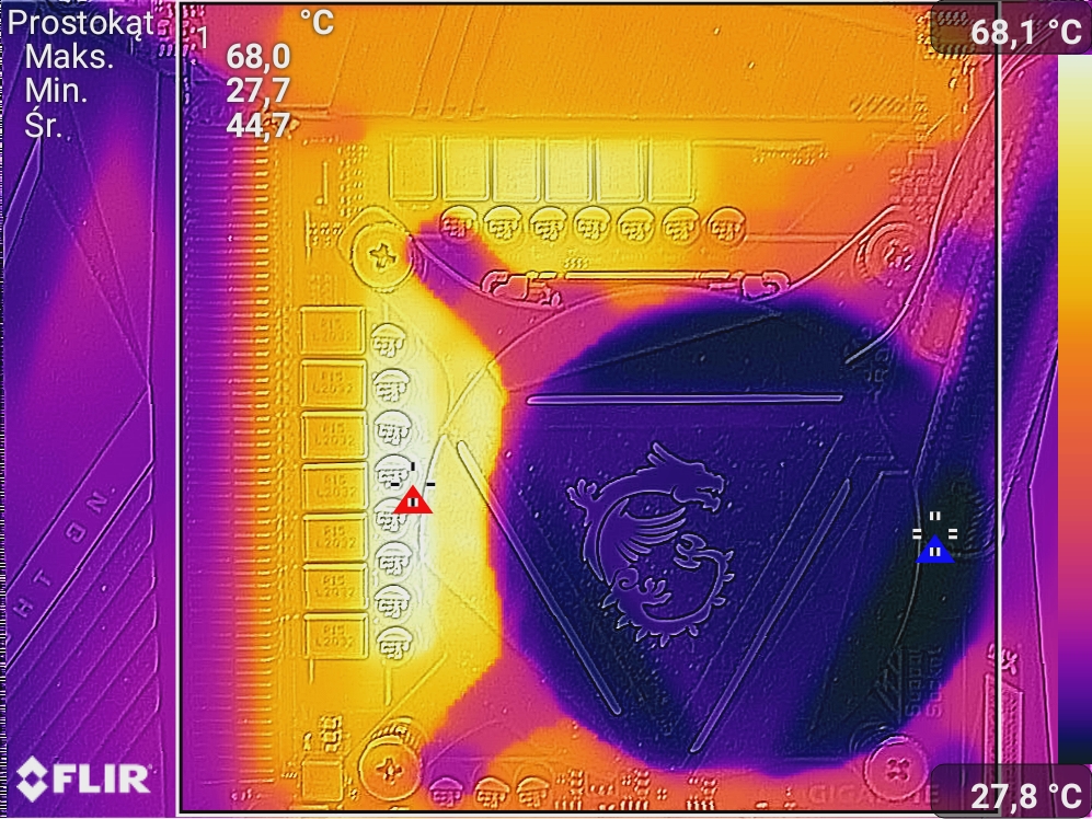 Sekcja zasilania nie należy do najchłodniejszych. Sam czujnik zwraca wyniki równe 71°C i 86°C. Nie są to oczywiście niebezpieczne temperatury, ale na pewno chłodzenie mogło zostać trochę lepiej rozwiązane.