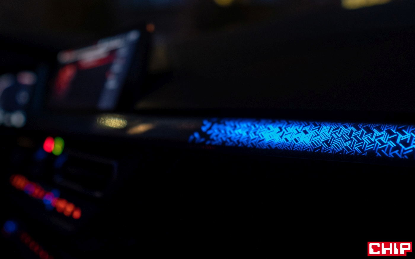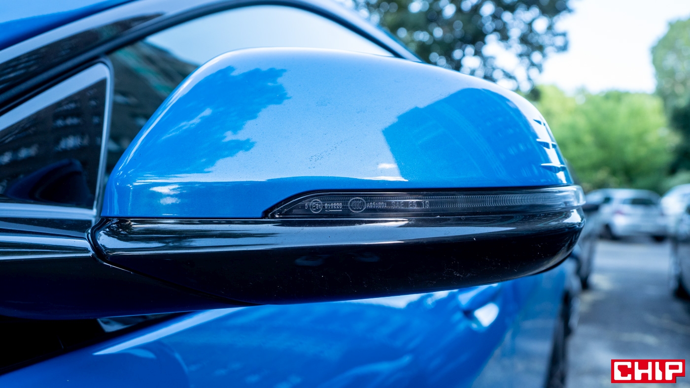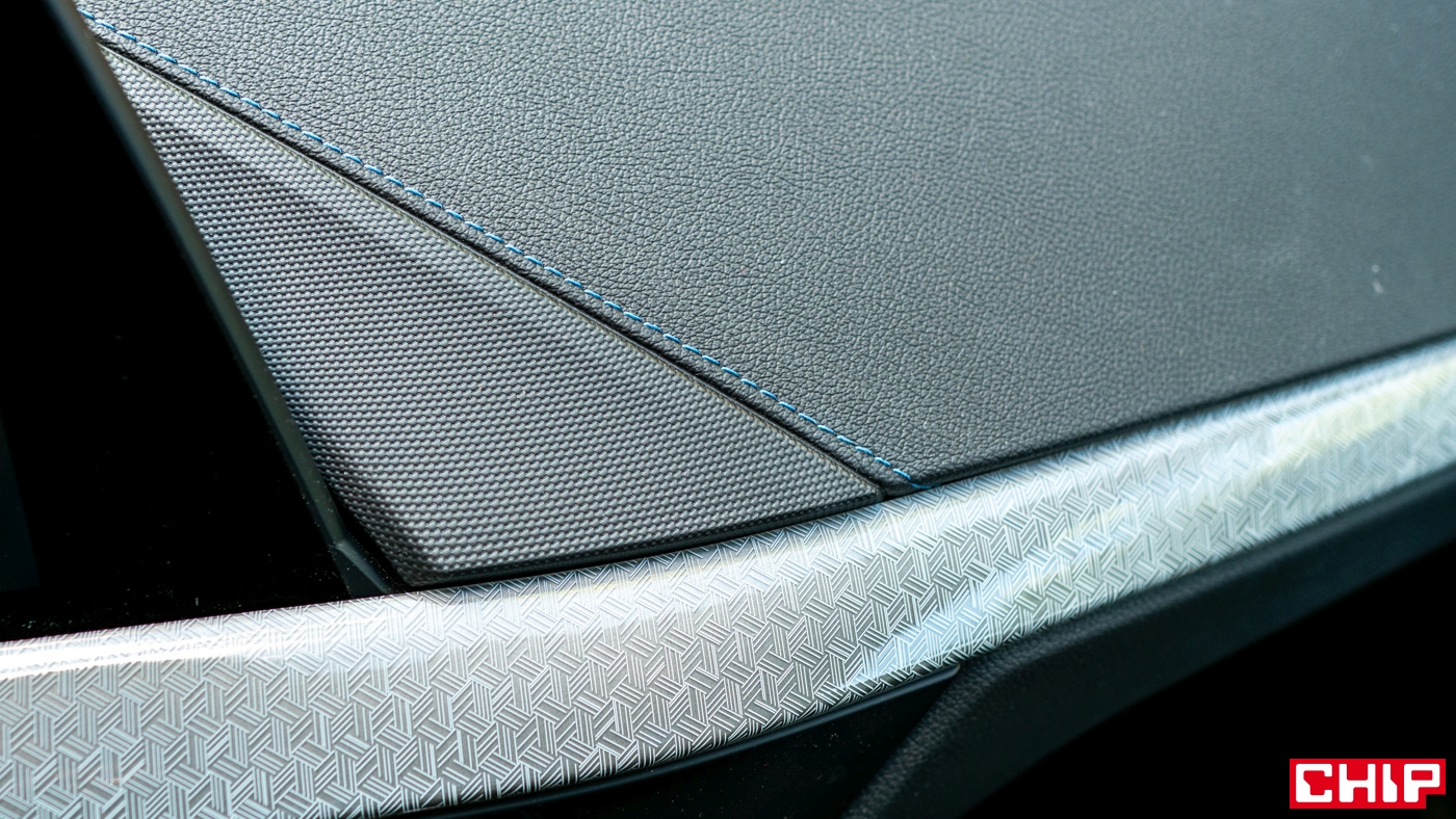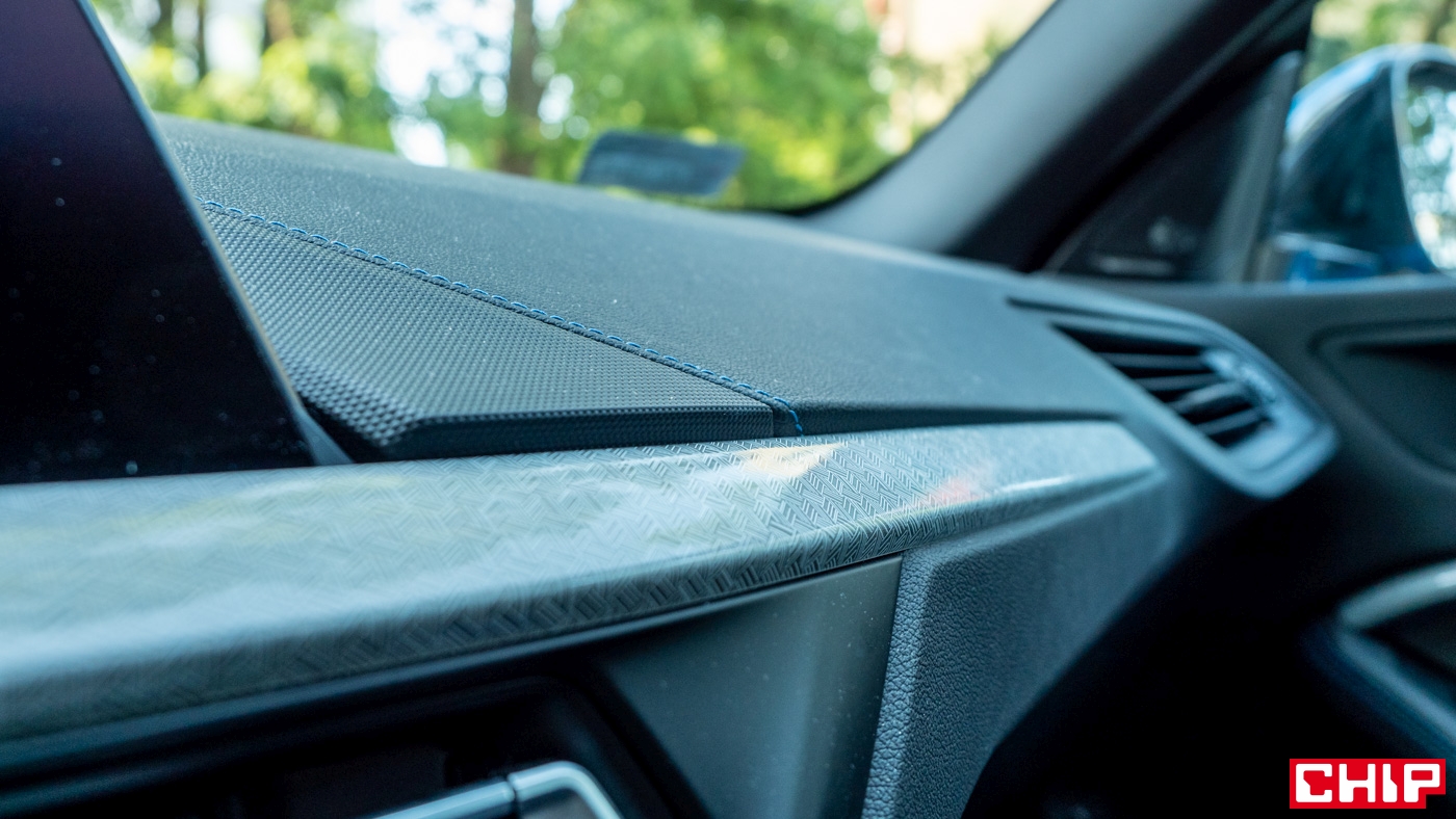 Kolejnym przyjemnym akcentem jest podświetlenie wnętrza. Na desce rozdzielczej i drzwiach znajdziemy podświetlane listwy opatrzone trójkątnymi wzorami. Możemy dostosować do swoich preferencji zarówno kolor podświetlenia, jak i jego intensywność. Listwy robią świetną robotę, nadając wnętrzu klimat bez rozpraszania uwagi kierowcy. W połączeniu z ogromnym panoramicznym dachem jazda w nocy jest czystą przyjemnością.