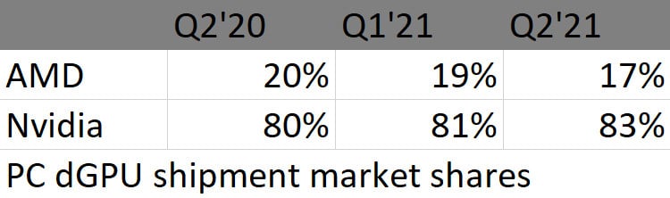 Takie wyniki nie dziwią nas w ogóle, bo NVIDIA w porównaniu do AMD rozegrała sprawę niedoborów na rynku mistrzowsko. Potwierdza to nie tylko obecna dostępność Radeonów RX 6000 i GeForce RTX 3000, ale też doniesienia, że ponoć najdroższa i najmniej popularna karta GeForce przebija całą sprzedaż kart AMD. Widać to po spadającym udziale AMD na rynku dGPU, czyli kart graficznych, bo w ujęciu kwartalnym spadek wyniósł aż 2%, co jest równoznaczne z 2% wzrostem udziału NVIDIA.