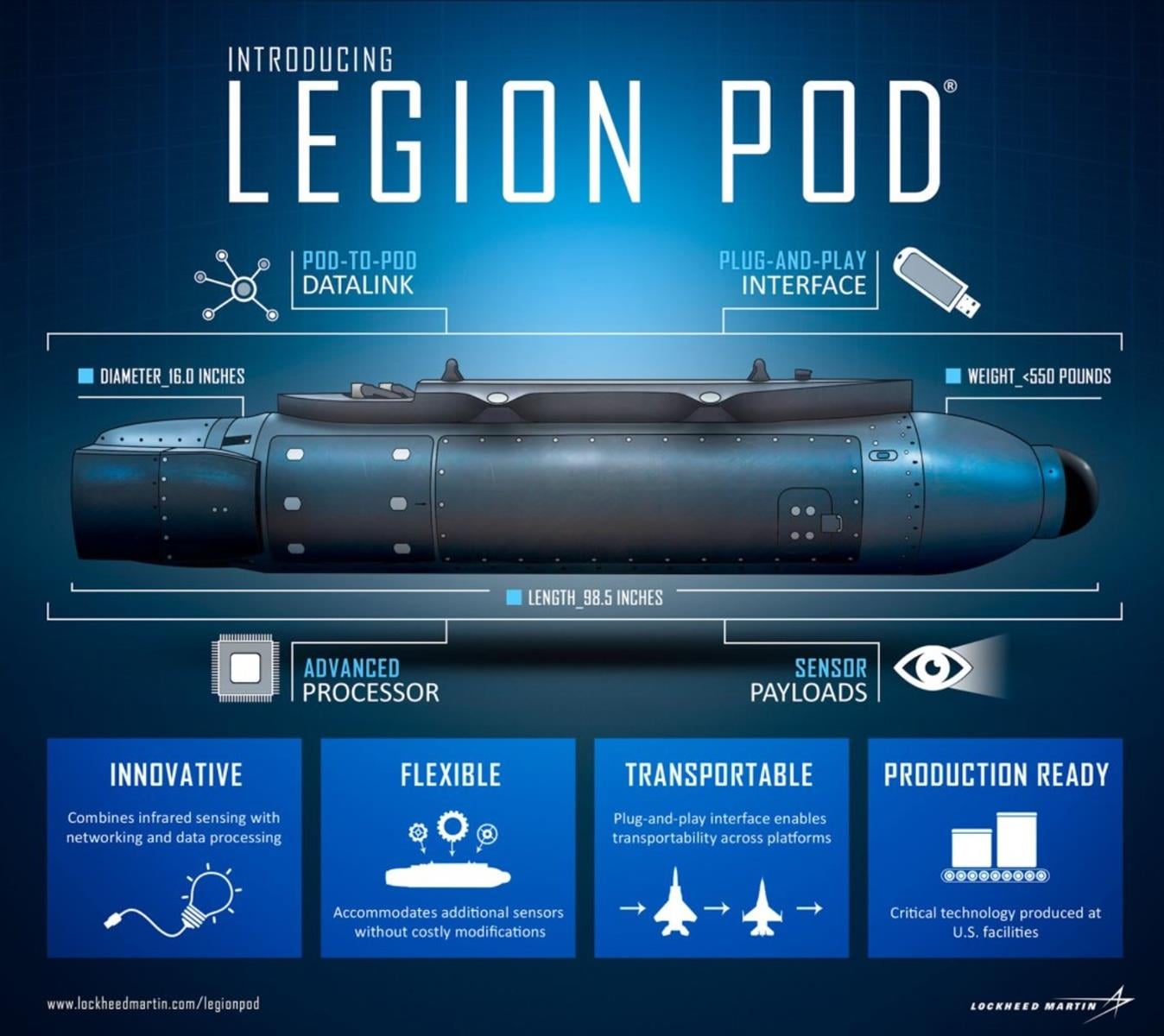 Wykorzystywanie tradycyjnego radaru wiąże się z wyższą szansą na wykrycie przez wroga i nie zawsze sprawdza się idealnie, bo anomalie lub systemy do jego zagłuszania mogą wprowadzić ludzi, lub operatorów w błąd. Dlatego też wcześniej Lockheed Martin opracował Legion Pod, czyli coś w rodzaju kapsuły o długości 250 centymetrów, szerokości 41 cm i wadze 250 kg. Ta zastępuje aktywny radar pasywnym czujnikiem IRST21, który współpracuje z zaawansowanymi komputerami przetwarzania danych w celu wykrywania i śledzenia celów na podstawie promieniowania podczerwonego.