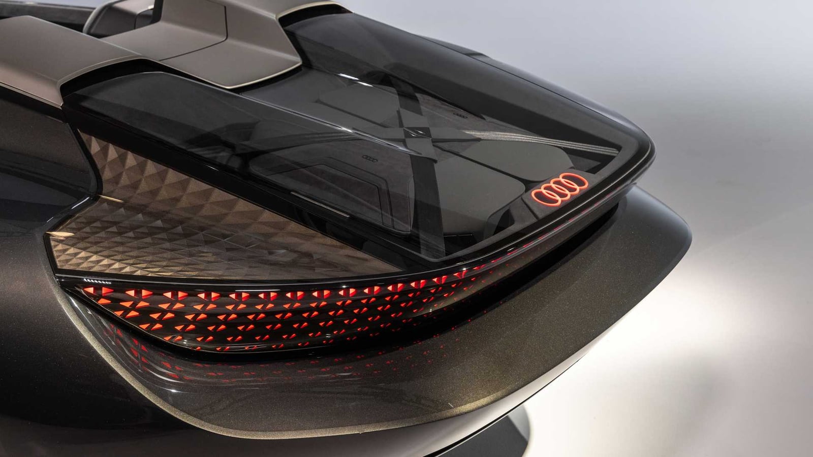Chociaż niski i w pełni elektryczny, Skysphere otrzymało długą, szeroką maskę, pod którą normalnie znalazłby się wielki silnik spalinowy. Poszerzona nad błotnikami sekcja ładnie przechodzi w dominujący na przedniej konsoli motyw Audi Singleframe z podświetlanym, czteropierścieniowym emblematem wystającym z panelu. Zabawy światłem jest tutaj zresztą od groma, bo dziesiątki diod LED służą jako kierunkowskazy, a wąskie matrycowe reflektory z trójkątnymi elementami zapowiadają nową generację designu Audi. Na tyle znajdziemy też równie rozbudowane oświetlenie zamknięte w fascynującym spojlerze.