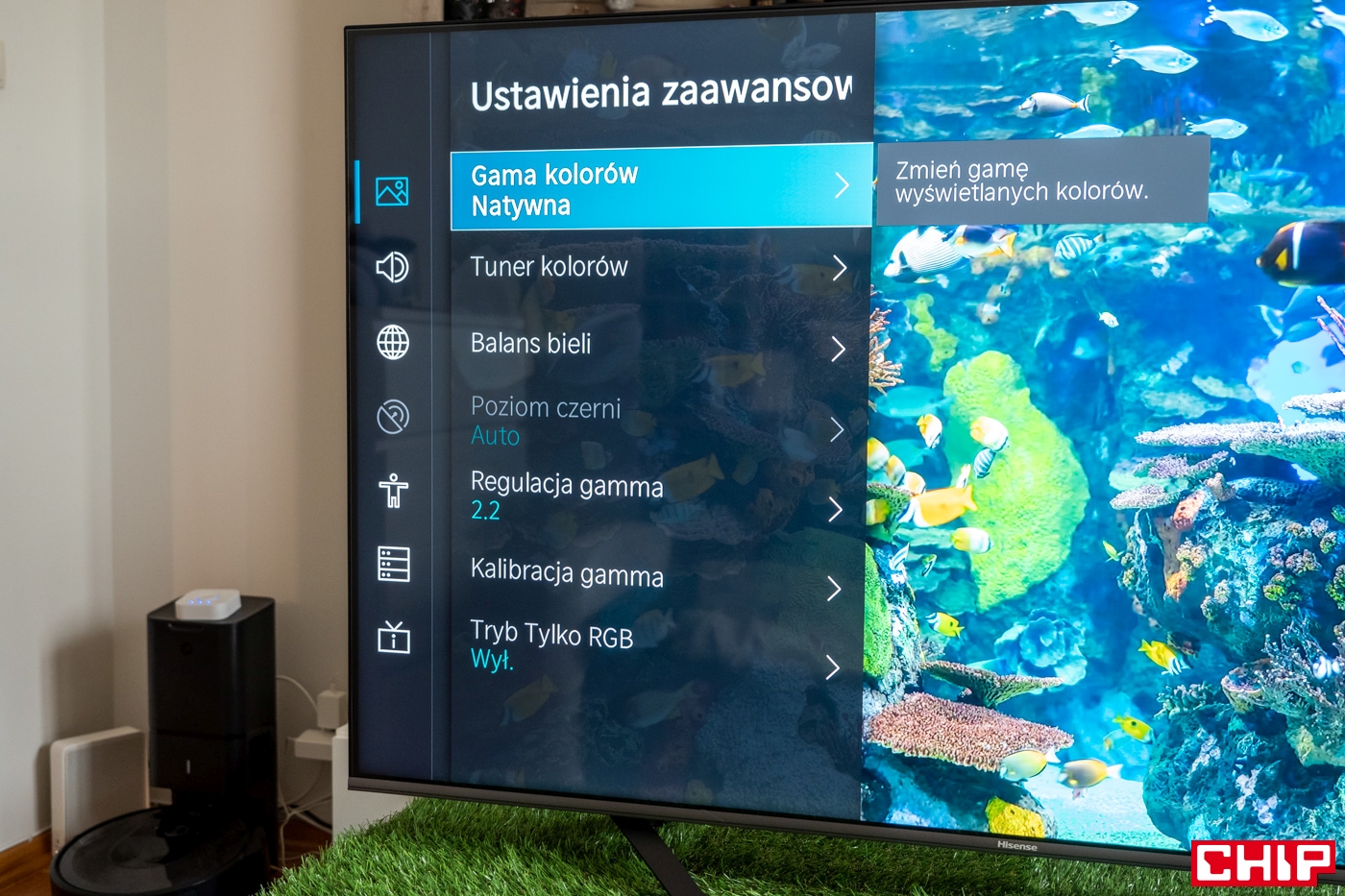 Telewizor Hisense A7GQ to telewizor z tylnym podświetlaniem i to całkiem niezłym jak na podświetlanie typu Direct, wyszło to lepiej niż w niejednym ekranie podświetlanym krawędziowo. Do dyspozycji mamy jednak matrycę IPS 60 Hz, która nie grzeszy czernią i kontrastem. Za to jest wzmocniona kropkami kwantowymi co też jest czymś niebywałym, mamy więc wsparcie dla szerokiej palety barw, choć mówimy tu o pokryciu poniżej 90% DCI-P3 to jednak przy odrobinie posiedzenia z ustawieniami jesteśmy w stanie uzyskać bardzo satysfakcjonujące efekty. Zdecydowanie ciekawie to może wyglądać w wariancie 50-calowym, który ponoć korzysta z matrycy VA (niestety nie jestem w stanie tego zweryfikować).