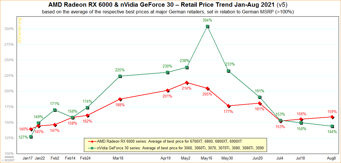 Nowe statystyki sprzedaży z sieci sklepów 3DCenter wskazują rozbieżność między trendem cen GeForce i Radeon, co rozpoczyna nowy rozdział w historii cen kart graficznych