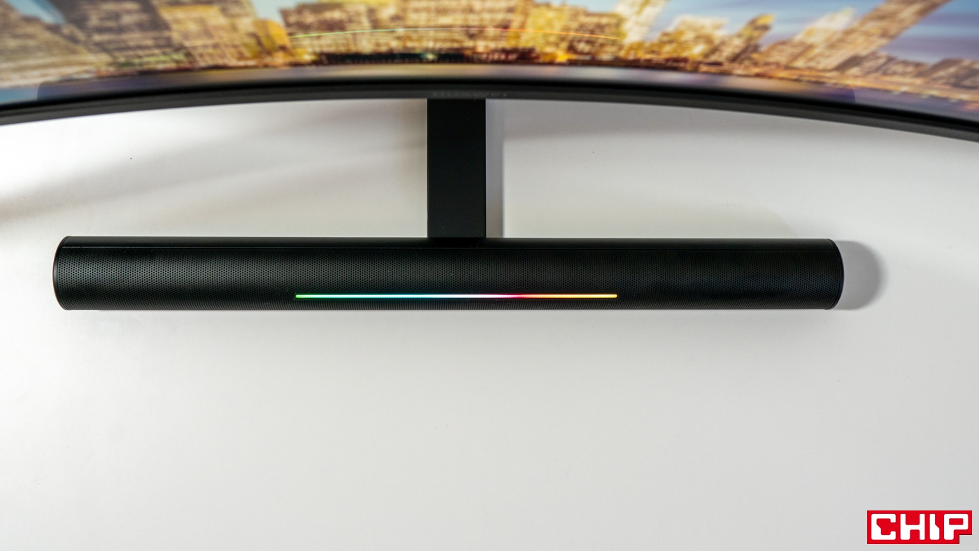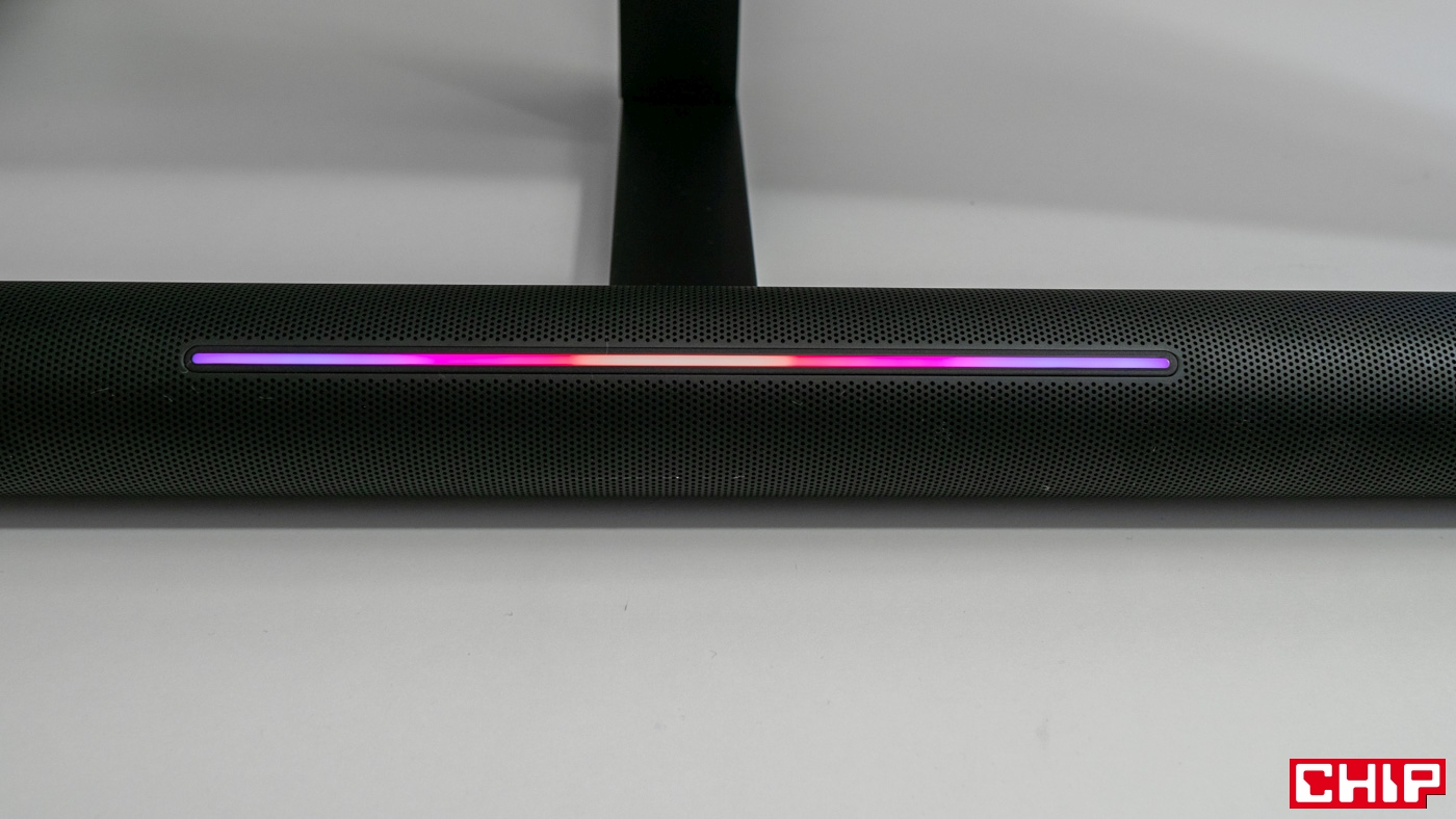 Nie ma tu żadnych przekombinowanych, kolorowych elementów znanych ze sprzętu gamingowego. Jest za to solidna, metalowa stopka oraz plastikowy monitor o stosunkowo cienkich ramkach wokół ekranu. Jedynym gamingowym akcentem jest pasek znajdujący się na podstawie będącej jednocześnie soundbarem. Możemy, choć nie musimy, ustawić na nim podświetlenie w dowolnym kolorze oraz dodać do tego animację. Przesuwania, mrugania, czy pływania. Pasek jest jednocześnie dotykowy i za jego pomocą w prosty sposób możemy regulować poziom głośności. To wygodne rozwiązanie i wygląda też całkiem nieźle.