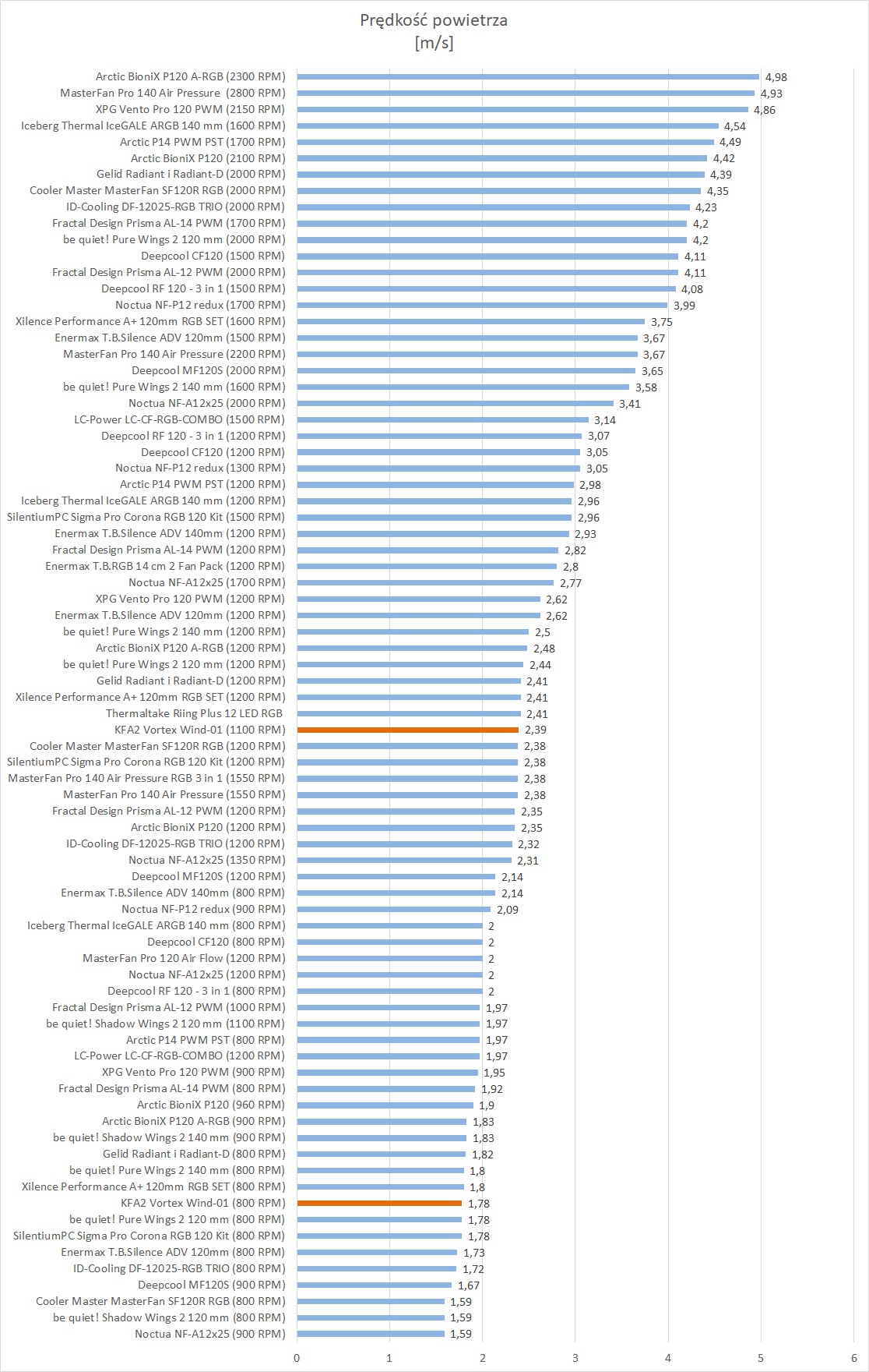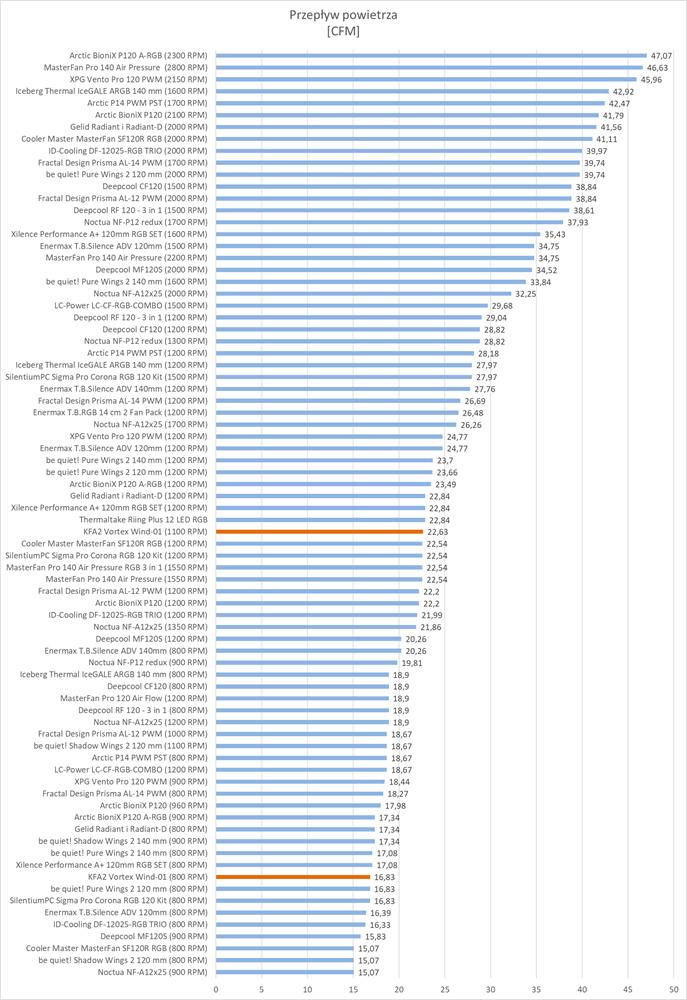 Wyniki jasno pokazują, że na wentylatorowi brakuje większych obrotów, aby znaleźć się w czołówce. Natomiast w przypadku 1100 RPM i 800 RPM wyniki są bardzo dobre. Śmigło zapewnia więc odpowiedni przepływ powietrza jak na swoje możliwości i ograniczenia.