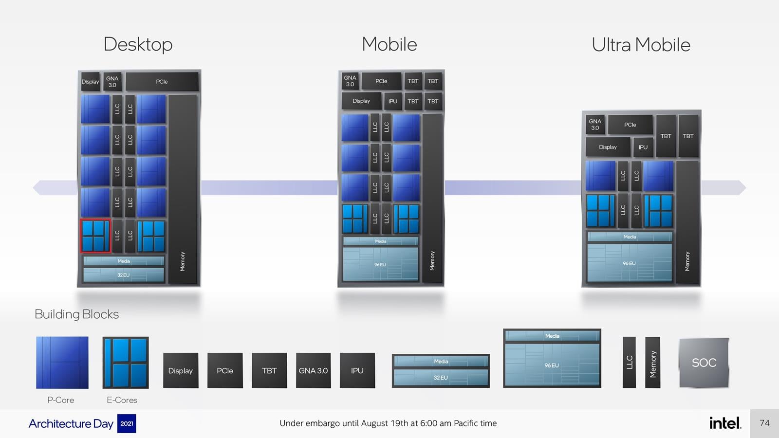 Finalnie procesory Alder Lake doczekają się trzech wariantów pomyślanych z myślą o urządzeniach stacjonarnych i mobilnych o TDP wahającym się od 9 do 125 watów. Te pierwsze będą najbardziej zaawansowane pod kątem procesora centralnego (CPU), ale te przeznaczone na rynek mobilny będą z kolei posiadały bardziej rozbudowany rdzeń graficzny (32 vs 96 jednostek wykonawczych “EU”) na bazie architektury Xe LP (12. generacji) wyprodukowany w ramach procesu Intel 7, czyli dawniej 10 nm Enhanced SuperFin.