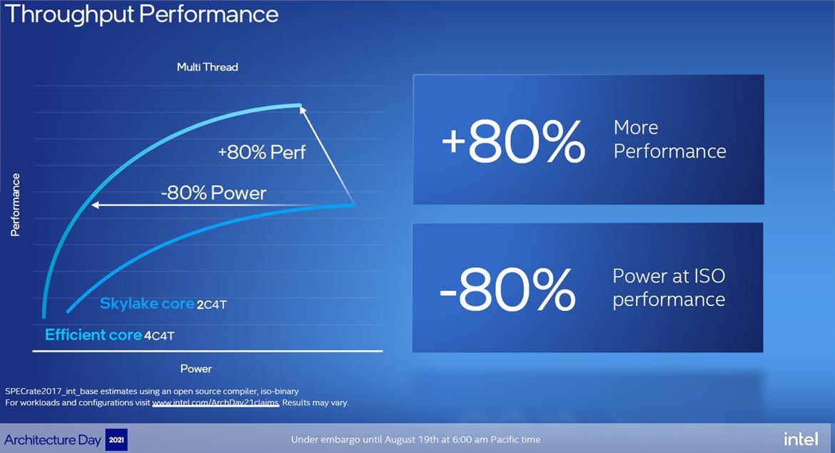 Jak widzicie powyżej, rdzeń E ‘Gracemont’ zapewnił ponad 40% wydajności przy zużyciu tej samej mocy względem starszego rdzenia. Innymi słowy, rdzeń procesora Skylake pożerał o 2,5 razy więcej energii, aby zapewnić ten sam poziom wydajności. Z kolei poniżej Intel pokazał wydajność w teście przepustowości, gdzie postawiono ze sobą 4-rdzenie Gracemont i dwa rdzenie Skylake, ale z włączoną wielowątkowością. Wynik? O 80% większa przepustowość przy tym samym poborze mocy, albo ta sama przy 80% mniejszym zużyciu energii.