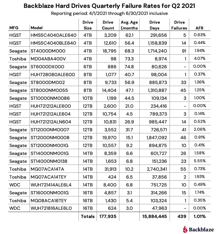 Poniżej możecie rzucić okiem na porównanie 23 dysków talerzowych, których poczynania firma Backblaze śledziła przez dziesiątki miesięcy. Raport dotyczy tego, jak wypadł ich stan w okresie od 4 stycznia do 30 czerwca bieżącego roku i obejmował łącznie 178166 egzemplarzy HDD, oceniając je pod kątem niezawodności. W ogólnym rozrachunku ta wzrosła do 1,01%, co stanowi wzrost nie tylko w porównaniu do ubiegłego kwartału (0,85%), ale też II kwartału poprzedniego roku (0,81%).