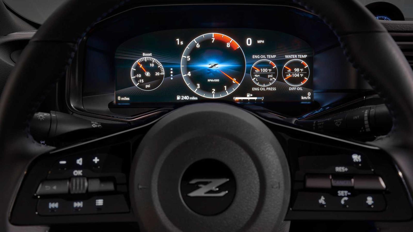 Przednie reflektory LED przywołują charakter retro i przez to nie pasują zbytnio do znacznie bardziej nowoczesnej sekcji na tyle, gdzie błyszcząca wstawka tuż pod klapą bagażnika jest domem dla podwójnych świateł LED, łącząc się wizualnie z dolnym zderzakiem wykończonym dwoma podwójnymi końcówkami układu wydechowego. Wewnątrz z kolei Nissan połączył nowoczesne technologie, klasykę i dbałość o komfort, stawiając na cyfrowe wskaźniki inspirowane tymi z modelu 240Z, 8-calowy ekran infotainment, czy sportowe fotele kubełkowe.