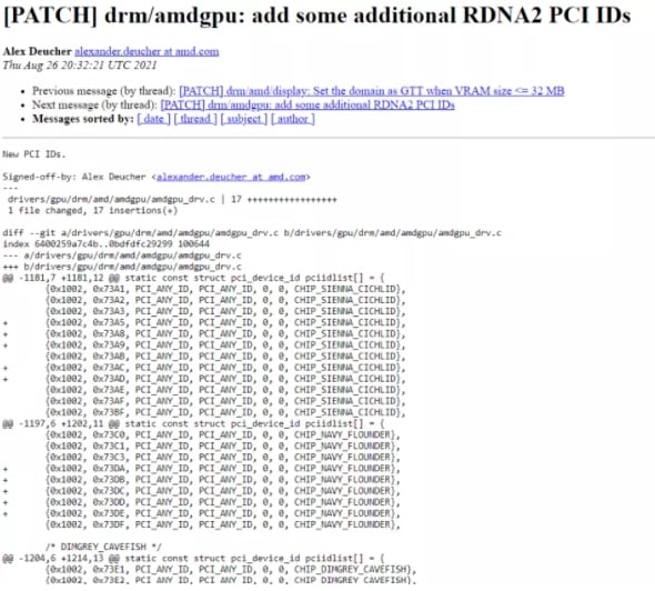 Wspomniana aktualizacja obejmuje aż 17 dodatkowych identyfikatorów PCI i tak też lista zaczyna się od ID Sienna Cichlid, czyli modeli z GPU Navi 21, która obejmuje 0x73A5, 0x73A8, 0x73A9, 0x73AC, 0x73AD. Te pięć identyfikatorów jest zupełnie nowych i rozszerza obecny zbiór siedmiu. Podobnie postępują nowe identyfikatory Navy Flounder, czyli tych dla Navi 22 (0x73DA, 0x73DB, 0x73DC, 0x73DD, 0x73DE), rozszerzając listę PCI do dziewięciu.