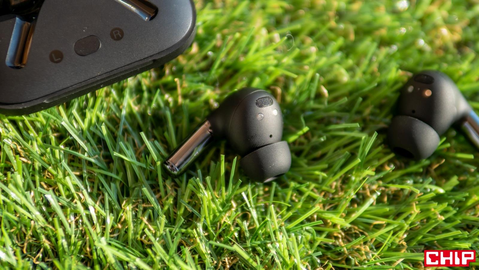 Jeśli idzie o same słuchawki, to te ewidentnie wyróżniają się swoim kształtem na tle innych modeli ANC. Posiadają znacznie pogrubioną obudowę certyfikowaną klasą IP55, którą połączono ze standardowym pałąkiem i już na pierwszy rzut oka widać, że ta składa się z łącznie sześciu głównych elementów. Na nich rozplanowano po dwa piny ładujące, czujnik obecności słuchawek w uszach i mikrofon wewnętrzny (na sekcji obok gumki).