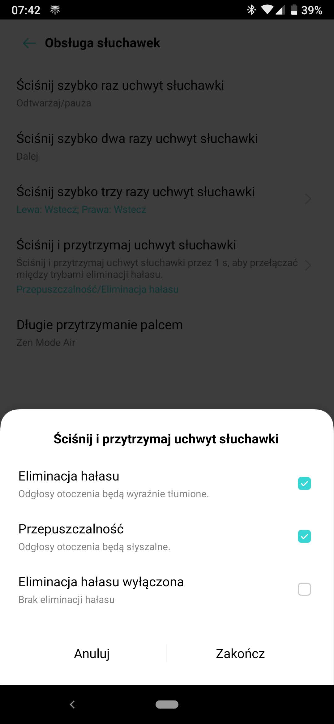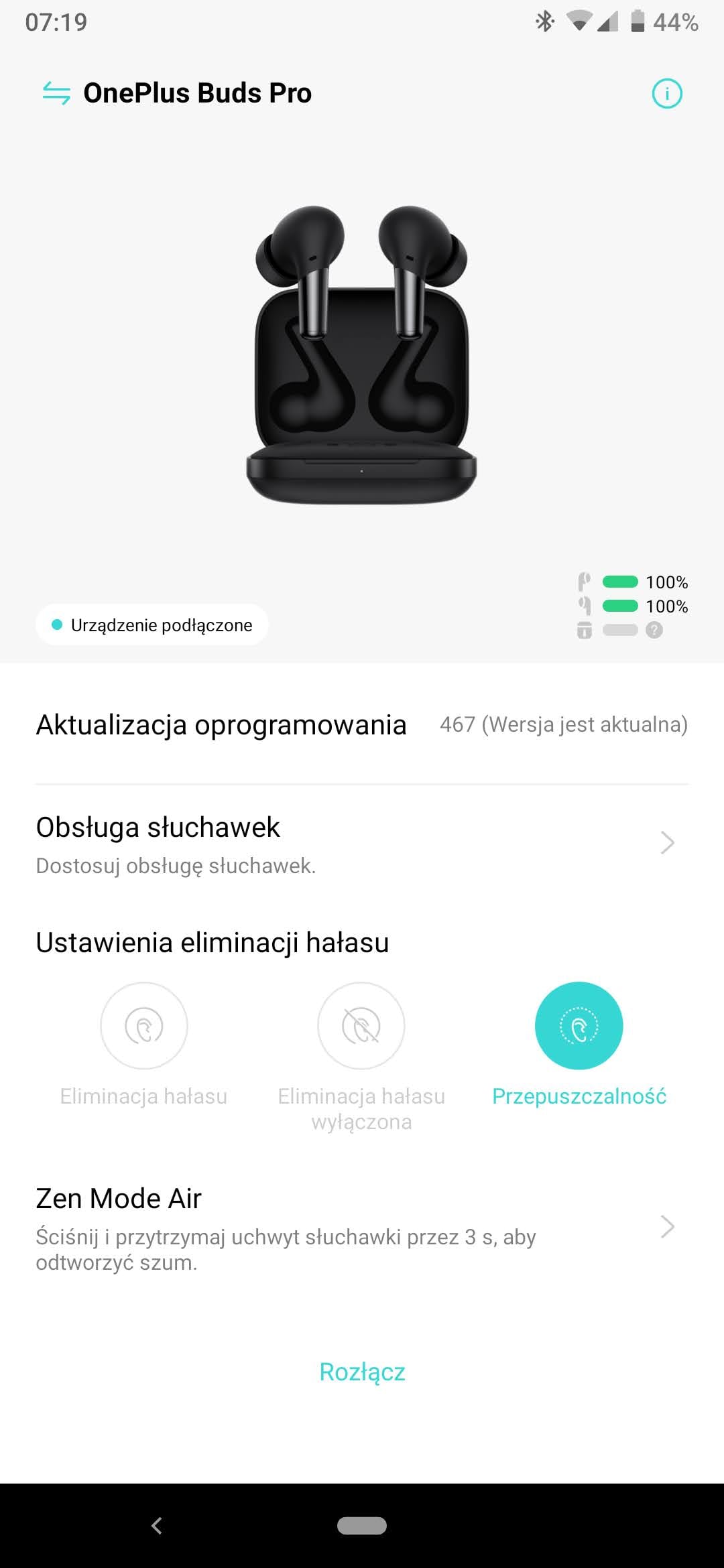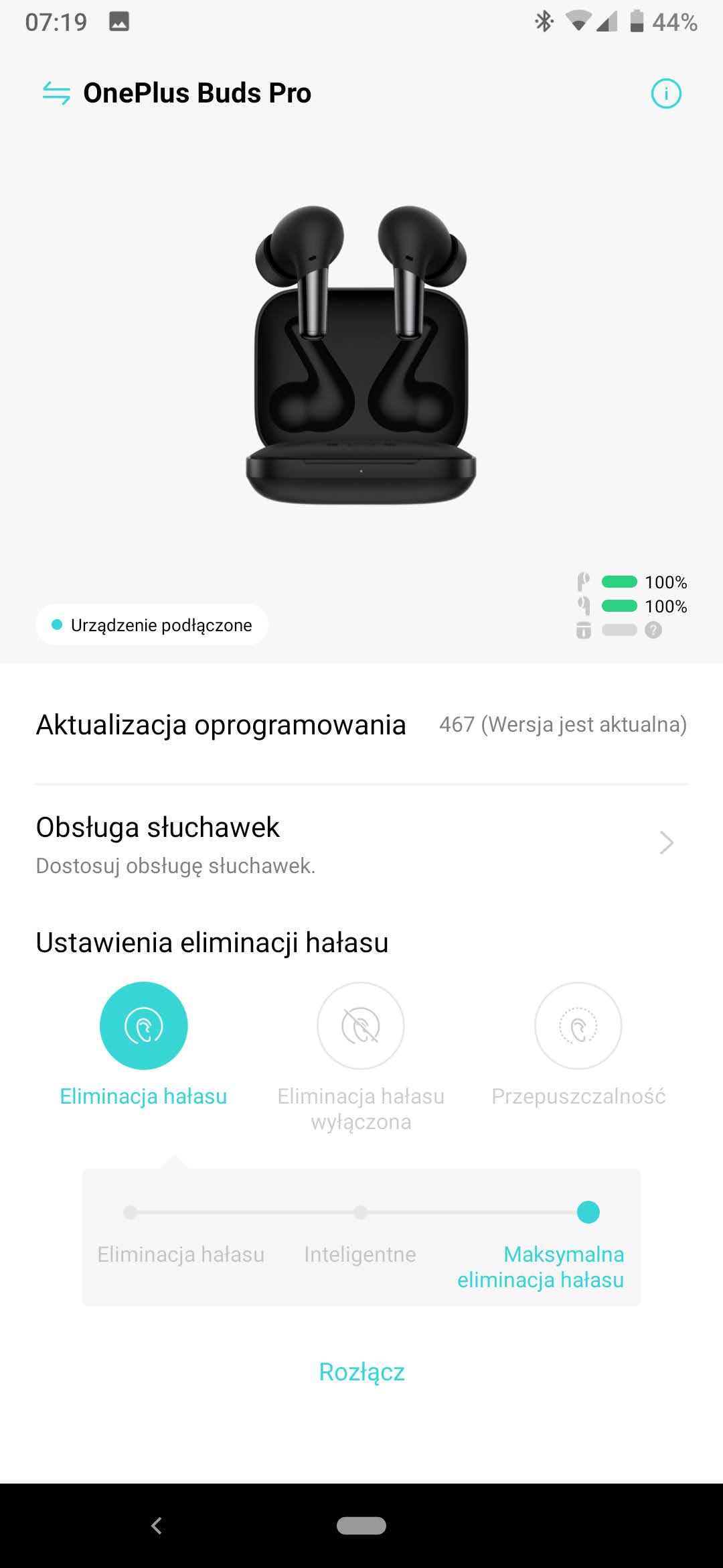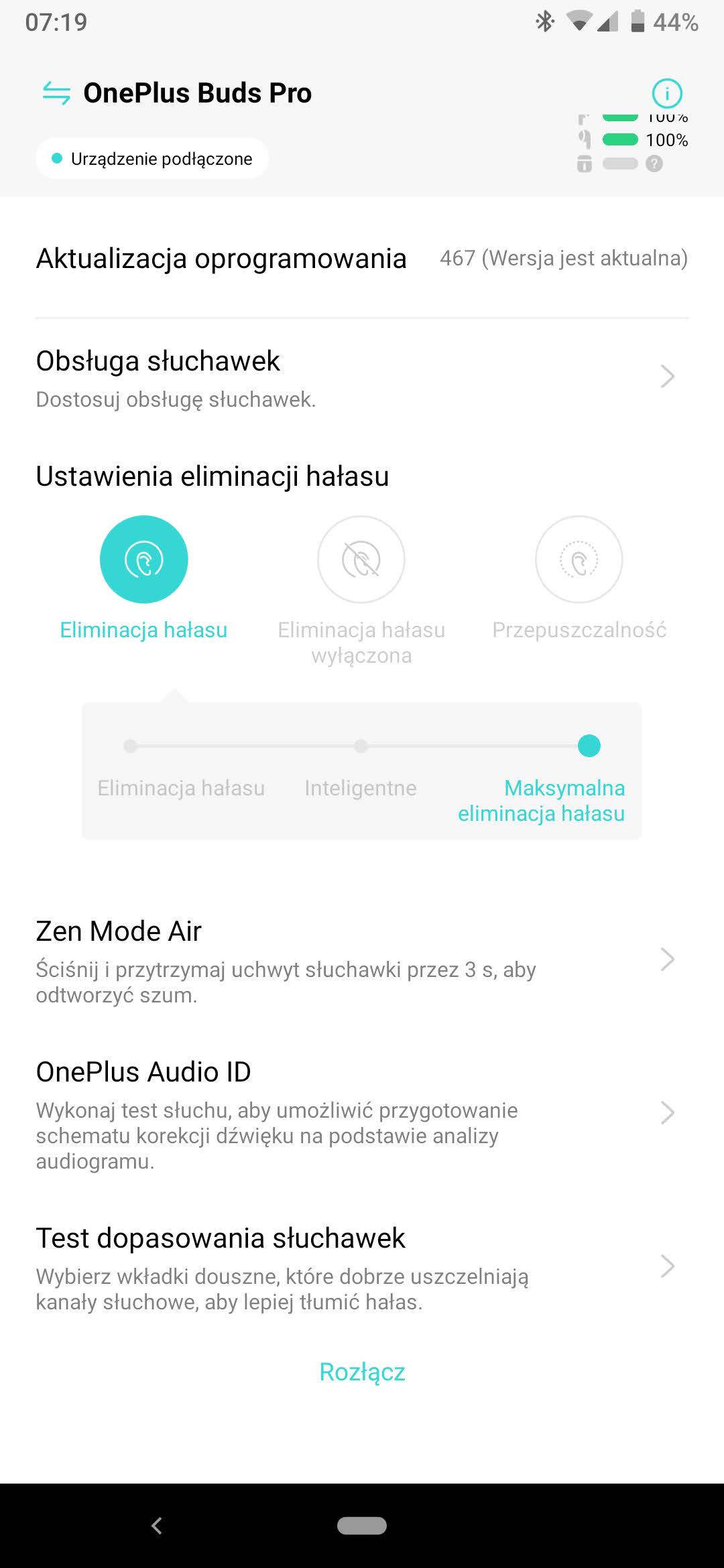 Ten jest dostępny w aplikacji HeyMelody, która jest HUBem dla większości słuchawek OnePlusa. W niej możemy przeprowadzić aktualizację firmware, dostosować w pewnym stopniu funkcje sterowania oddzielone od prawej i lewej słuchawki, wśród których nie znalazła się opcja regulacji poziomu dźwięku. W niej ustawimy też tryb działania ANC między łagodnym inteligentnym (dynamicznie regulowanym) i wysokim tłumieniem.