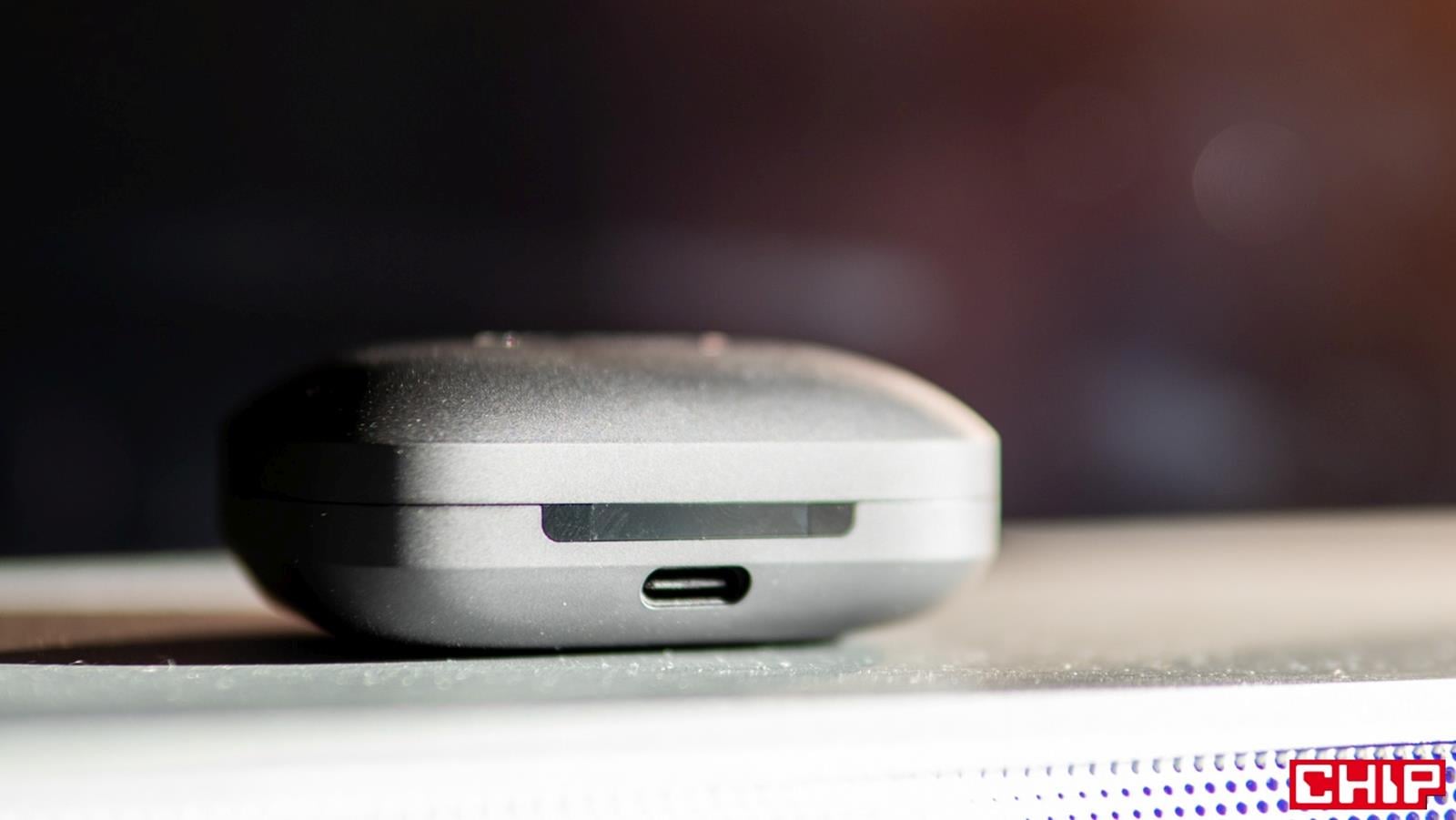 To z łatwością mieści się nie tylko w dłoni, ale też w kieszeni, a postawienie na matowy plastik wysokiej jakości ewidentnie się opłaciło. Dzięki temu etui Buds Pro jest nie tylko przyjemniejsze w dotyku, ale też sprawdza się lepiej przy otwieraniu go, jak zwieńczonego nazwą producenta wieczka na metalowym zawiasie, pod którym znajdziemy ładnie prezentujące się słuchawki. Wewnątrz oprócz styków ładowania znalazł się też przycisk funkcyjny, a z podobnych elementów warto wyróżnić diodę informacyjną na przedniej krawędzi i port USB-C do ładowania na tej tylnej.