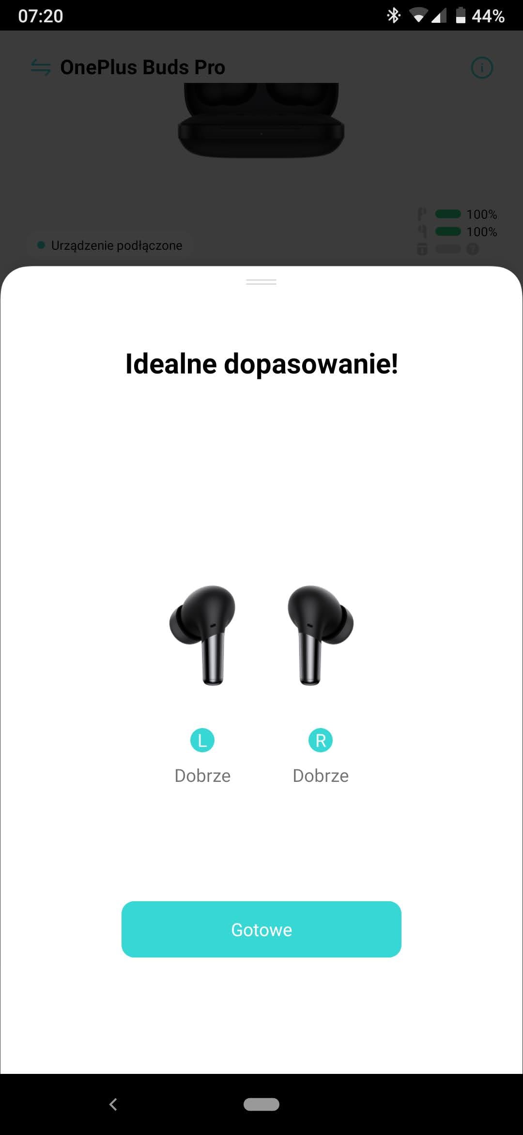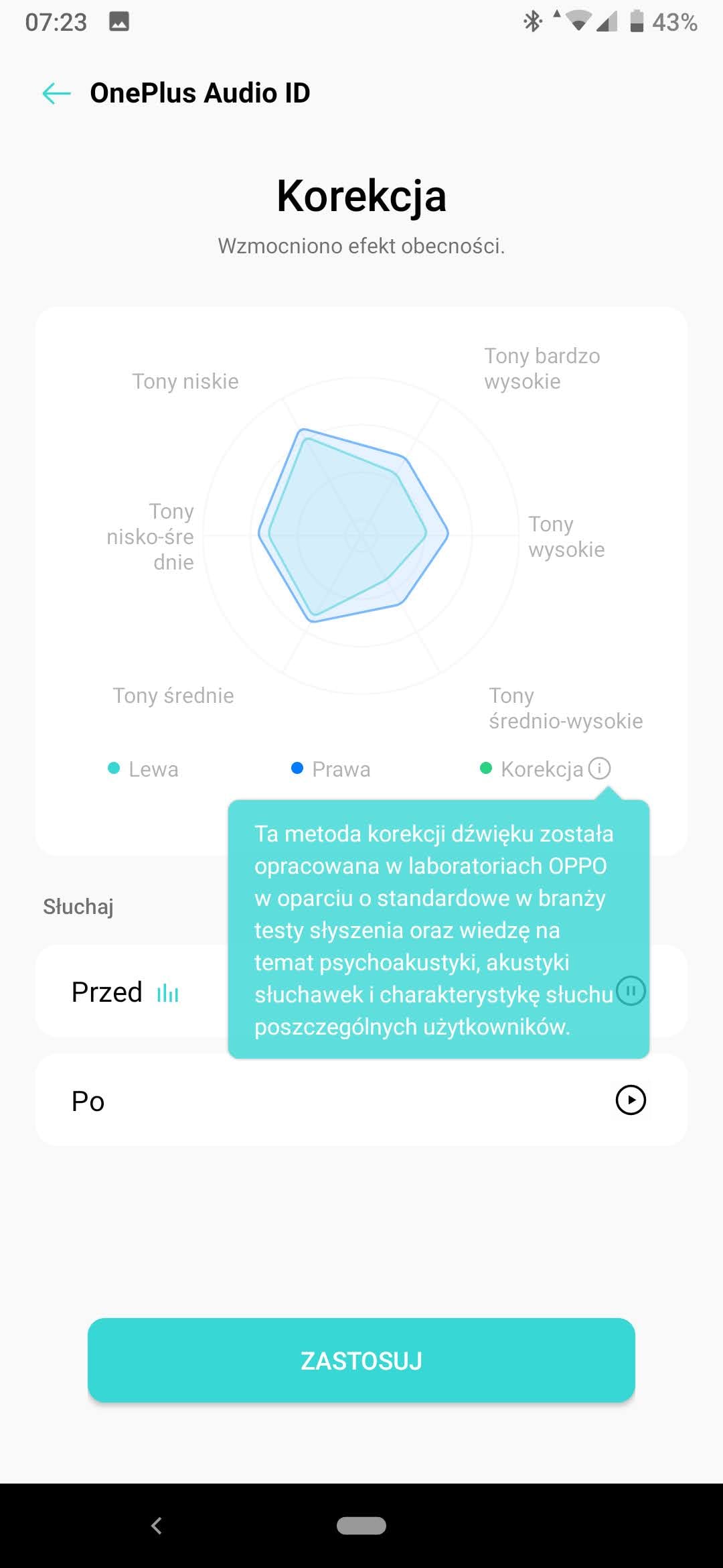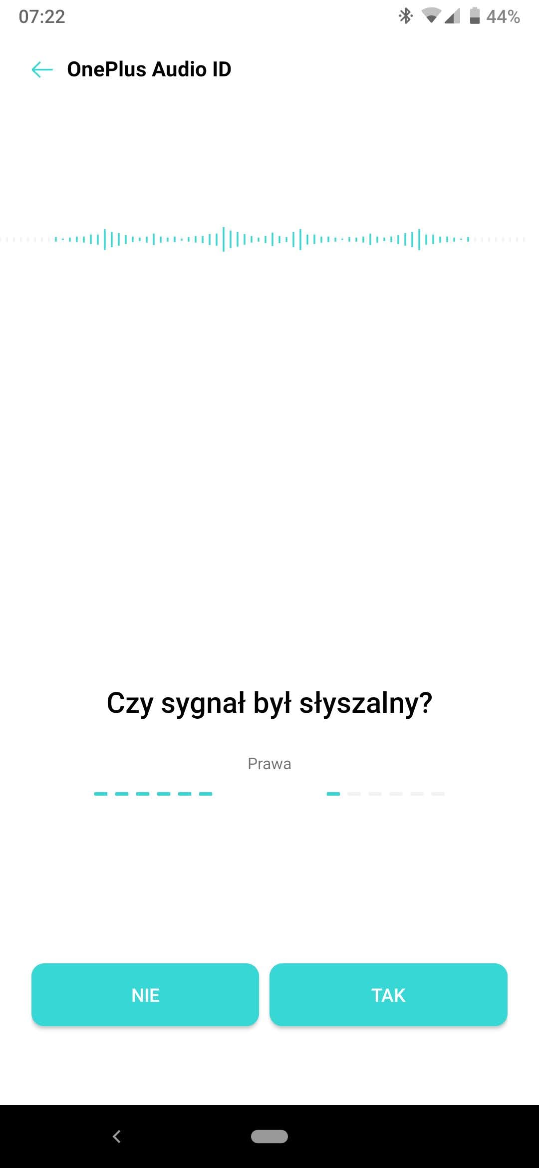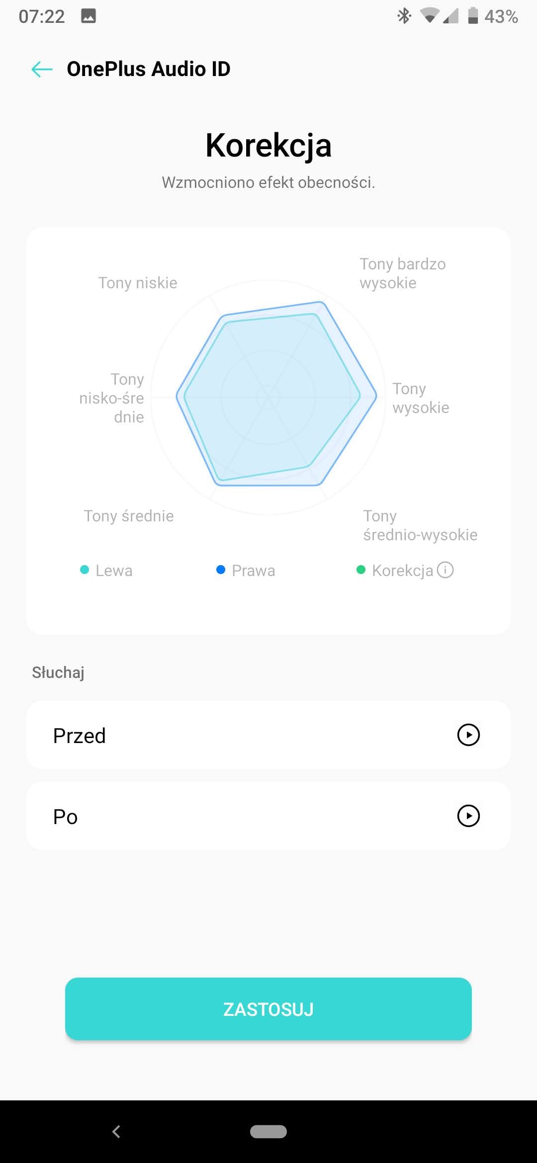 W mojej opinii najważniejsze opcje sprowadzają się do trzech najniżej położonych zakładek, a więc testu dopasowania słuchawek i powiązanej z nią funkcji OnePlus Audio ID. Ta poddaje nas kilkuminutowemu sprawdzianowi pod kątem słyszanych dźwięków zależnie od ucha i na tej podstawie dostosowują korekcji brzmienia. Przykładowo moje dwa testy, które zrealizowałem celowo inaczej, wzmocniły “efekt obecności”, co objawiło się poszerzoną sceną muzyczną i “poprawiło efekt stereo”. To ostatnie sprowadziło się do podbicia głośności.