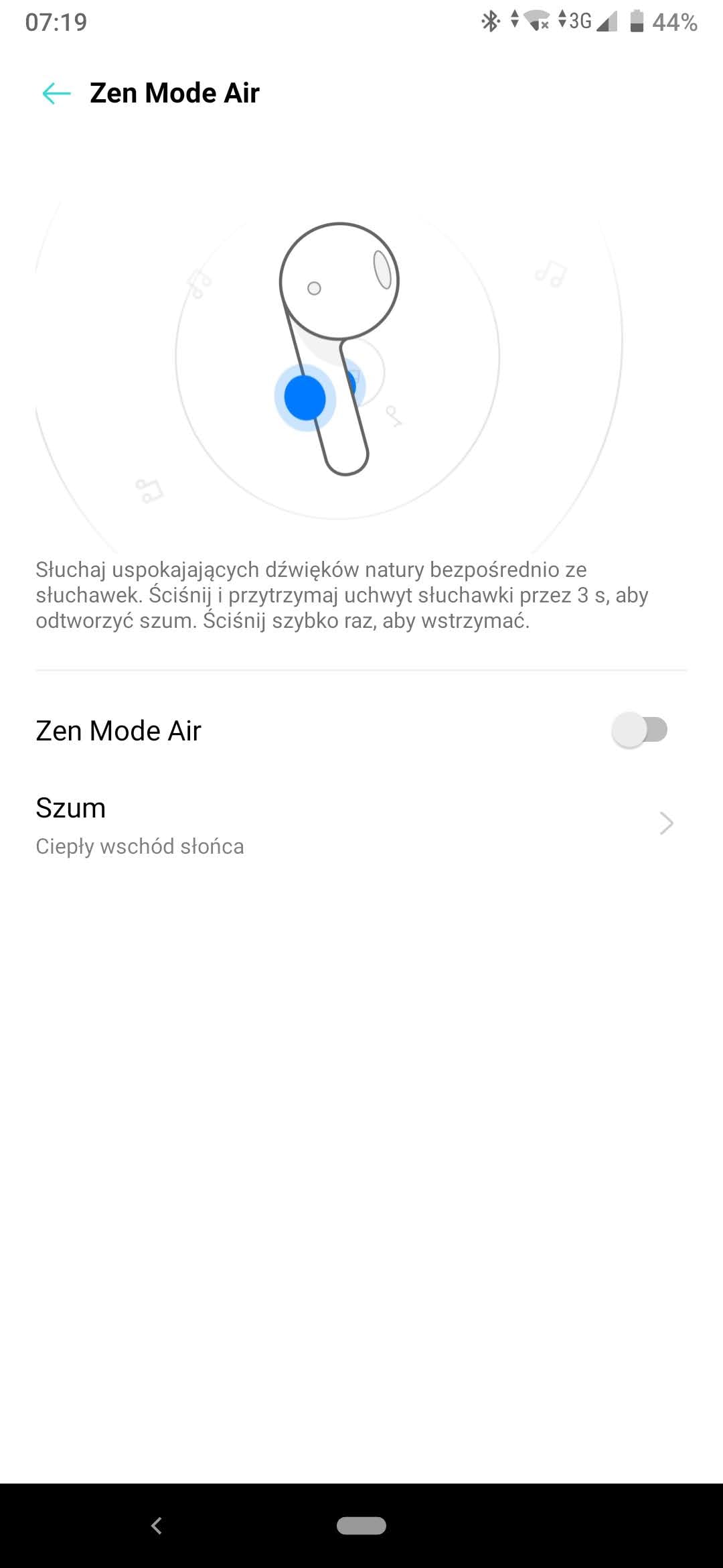 Świetnym dodatkiem jest też Zen Mode Air, którego aktywujemy poprzez przytrzymanie paneli dotykowych na trzy sekundy. To samo w sobie jest źle rozwiązane, bo przy okazji aktywujemy/dezaktywujemy tryb otoczenia, czy ANC (dzieje się to przy 2-sekundowym przytrzymaniu), co zmusza nas do dwukrotnego aktywowania tego samego. Ten tryb sprowadza się do odtwarzania jednego z pięciu nagrań typu ambient, ale tylko jeden jesteśmy w stanie zapisać w pamięci słuchawek.