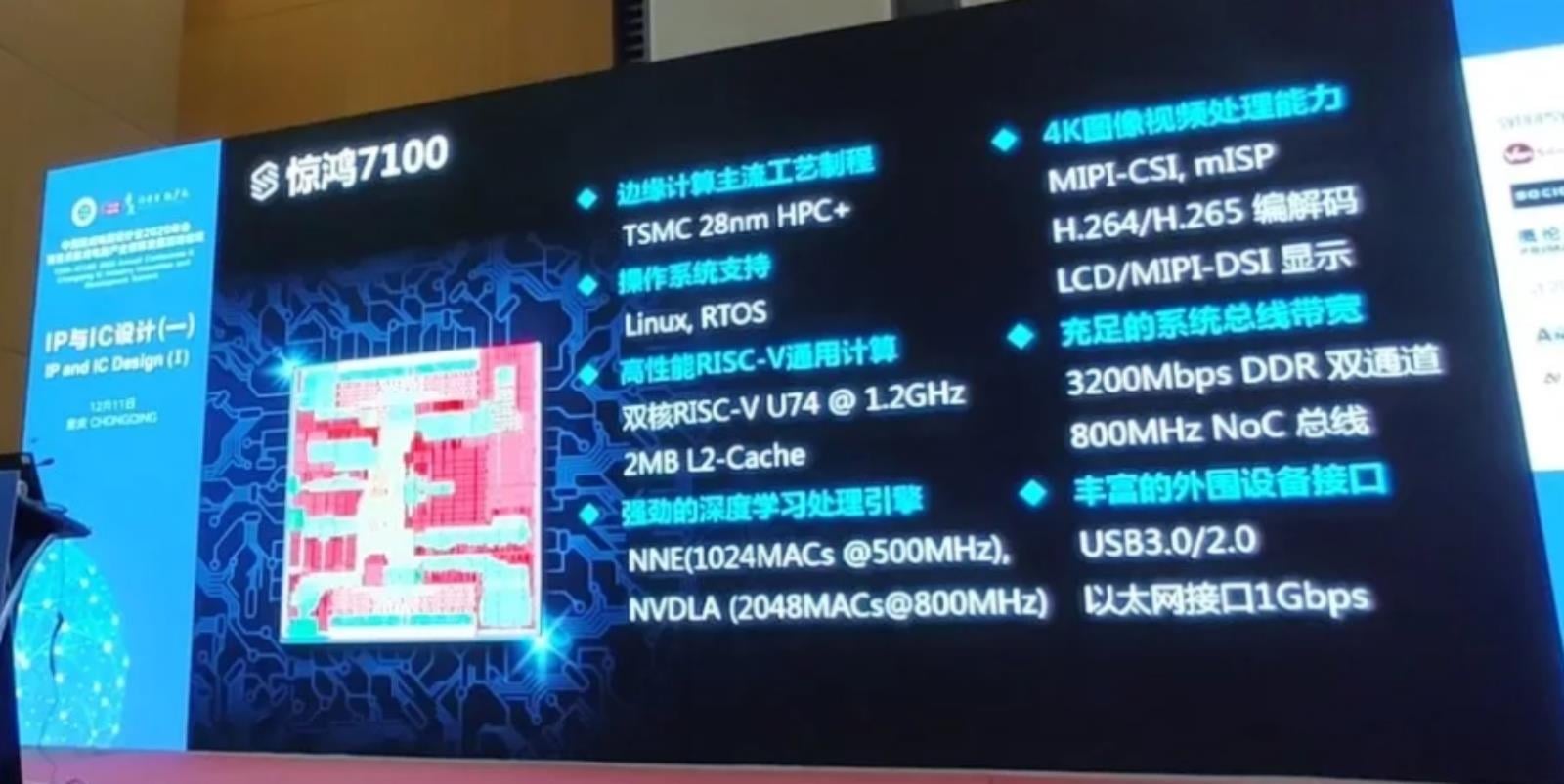 Widoczne powyżej zdjęcie z prezentacji (via Lilliputing) wskazuje, że sprowadzający się do “jednego laminatu” PC na bazie RISC-V, sięgnie po współpracujący z maksymalnie 8 GB pamięci LPDDR4 procesor StarFive JH7100, produkowany z wykorzystaniem 28 nm procesu technologicznego firmy TSMC. Ten sprowadzi się do konfiguracji z parą rdzeni SiFive U74 taktowanych zegarem 1,5 GHz, które ponoć swoją wydajnością odpowiadają rdzeniom ARM Cortex-A55. Na pokładzie tego procesora znajdzie się też akcelerator sieci neuronowych NVDLA firmy Nvidia i Vision DSP Tensilica-VP6.
