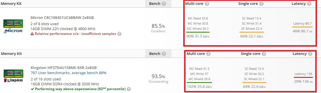 Tak więc, podczas gdy starszy test sparował ten procesor z dwoma 8-gigabajtowymi modłami DDR4 Kingston HyperX Fury DDR4-3200 o numerze kodowym HP37D4U1S8ME-8XR, ten nowszy objął parę kości Micron DDR5-4800 po 8 GB każdy (C8C1084S1UC48BAW). Chociaż nie znamy oficjalnej specyfikacji, wedle tej udostępnionej przez JEDEC 4800 MHz pamięci DDR5 powinny mieć opóźnienie CAS (CL) na poziomie 40.