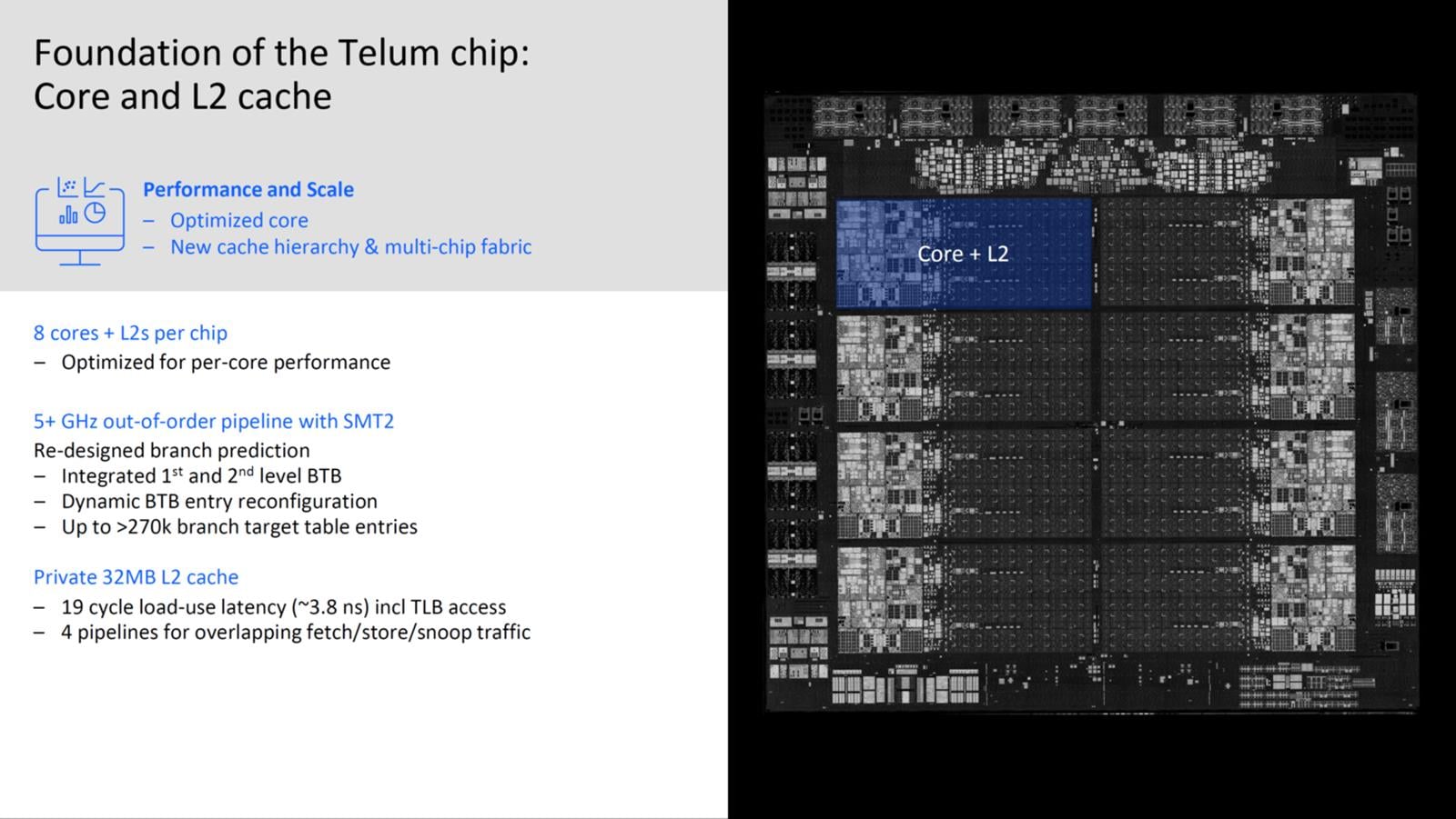 Nowoczesny proces produkcyjny sprawił, że procesor IBM Telum nowej generacji będzie chwalił się taktowaniem ponad 5 GHz, a to wspomoże wnieść wydajność na nowy poziom razem z nową funkcją przewidywania instrukcji (z ang. branch). Obok zwyczajnych jednostek obliczeniowych znalazły się też te z myślą o sztucznej inteligencji, którym żadne zadanie nie będzie straszne przez rozległą pamięć podręczną. Do wspomnianego poziomu drugiego swoje trzy grosze dorzucają też wirtualne L3 i L4, które są współdzielone przez wszystkie 8 rdzeni i wynoszą kolejno 256 i 2 GB.