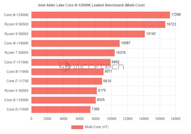 Co to oznacza? Sporo, co bezpośrednio wskazują wykresy przygotowane przez serwis Wccftech. Według nich Intel Core i9-12900K przebije wydajnością zarówno poprzednią generację Core, jak i konkurencję, odbierając AMD koronę króla wydajności wielowątkowej. W porównaniu do Intel Core i9-11900K procesor Alder Lake-S oferuje o 2% wyższą wydajność jednowątkową i 22% wielowątkową.