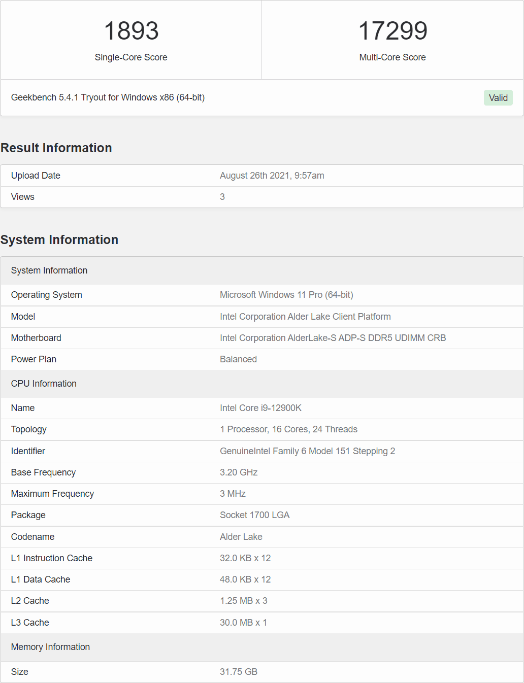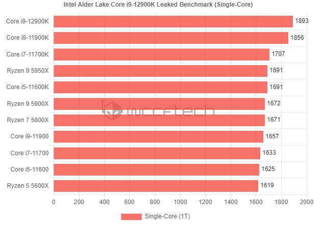 Rozkręci swoje zegary do 5,3 GHz w przypadku 1-2 wydajniejszych rdzeni Golden Cove i do 3,9 GHz przy zaangażowaniu 1-4 rdzeni Gracemont. Tryb Boost z udziałem wszystkich będzie z kolei wynosił kolejno 5 i 3,7 GHz. Niestety nie wiemy, jak wysokie taktowania osiągał dzisiejszy egzemplarz, ale wiemy, że w teście osiągnął 1893 punktów przy operacji jednordzeniowej i 17299 punktów przy tej wielordzeniowej.