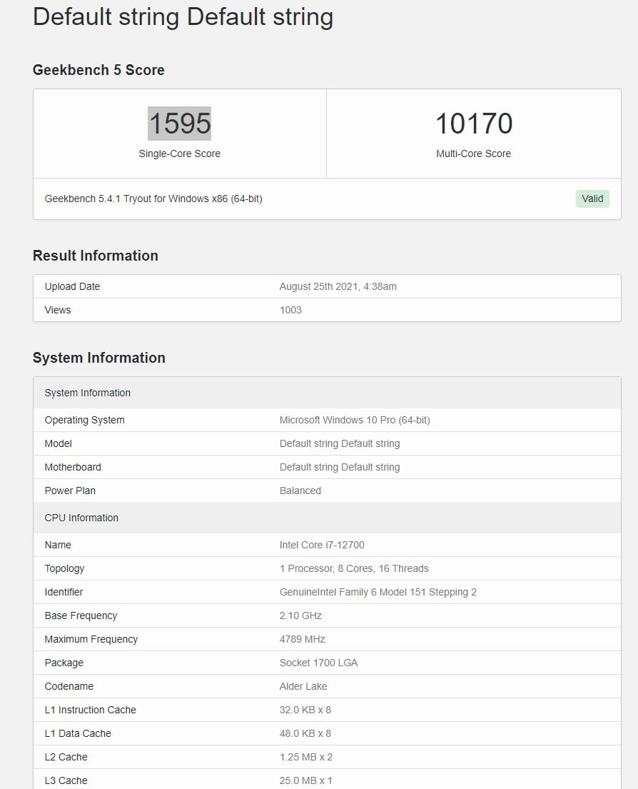 W teście jednowątkowym Intel Core i7-12700 z wykorzystaniem 32 GB nieznanej pamięci operacyjnej osiągnął 1595 punktów, a w wielowątkowym 10170 punktów. Jego poprzednik, i7-11700 chwali się z kolei wydajnością kolejno 1562 i 9309 punktów.