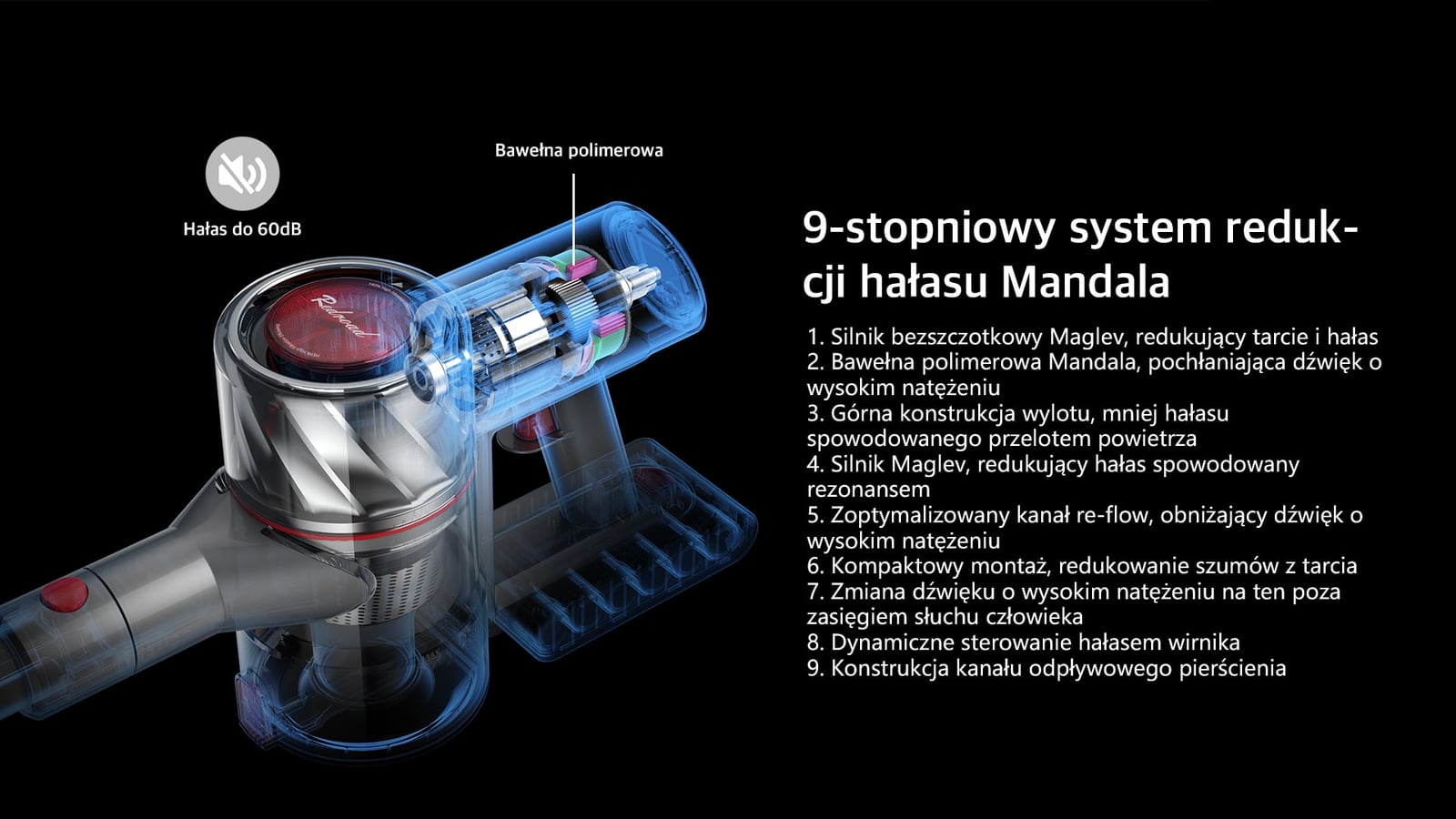 9-stopniowy system redukcji hałasu Mandala zadbają o ciszę – odkurzacz nie musi być już hałaśliwym urządzeniem, o czym zdecydowanie świadczy właśnie RedRoad V17 wyposażony w wiodącą technologię redukcji hałasu zwaną 9-stopniowym systemem Manadala. Składa się na niego: