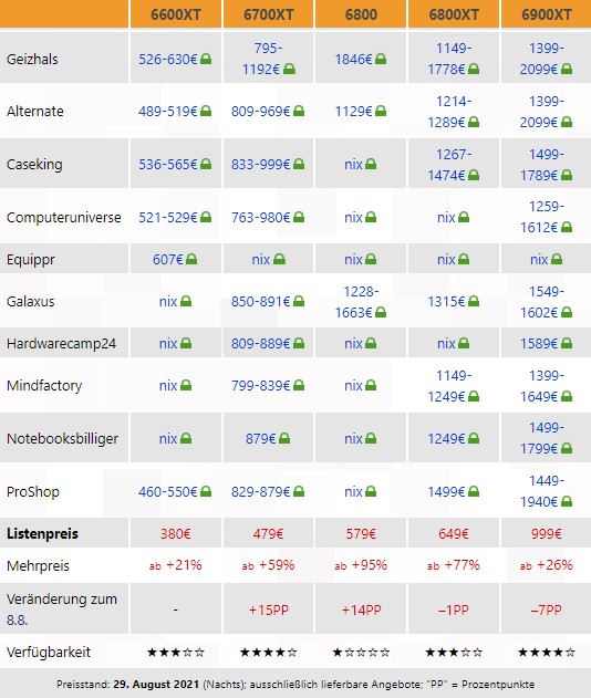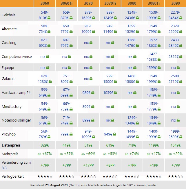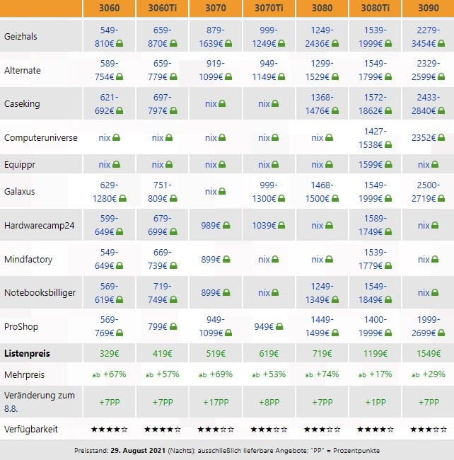 Wedle statystyk, trwające od marca spadki cen kart graficznych NVIDIA zakończyły się (przynajmniej dla sklepów w Niemczech i Austrii, które 3DCenter obejmuje) 8 sierpnia i trwają aż do dziś. Ceny Radeonów od AMD rosną z kolei nieprzerwanie od początku lipca, ale w modele GeForce RTX, których dostępność jest o niebo lepsza (wiem, jak to brzmi, ale taka jest prawda) względem konkurencji, przyniosą nam z czasem wytchnienie.