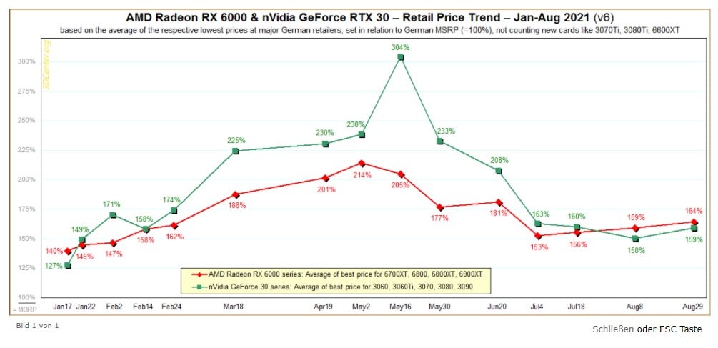 Miało być lepiej, bo rynek kart graficznych, od boomu kryptograficznego zapoczątkowanego od stycznia i trwającego do maja bieżącego roku, miał się stabilizować razem z powolnym znoszeniem ograniczeń pandemicznych, ale najwyraźniej napotkał teraz barierę. Tą barierą jest cena zawyżona o połowę, bo w ostatnich tygodniach za karty NVIDIA nowej generacji płaciliśmy o 50% więcej (dziś już 59%), a za AMD 59% (dziś już 64% więcej).