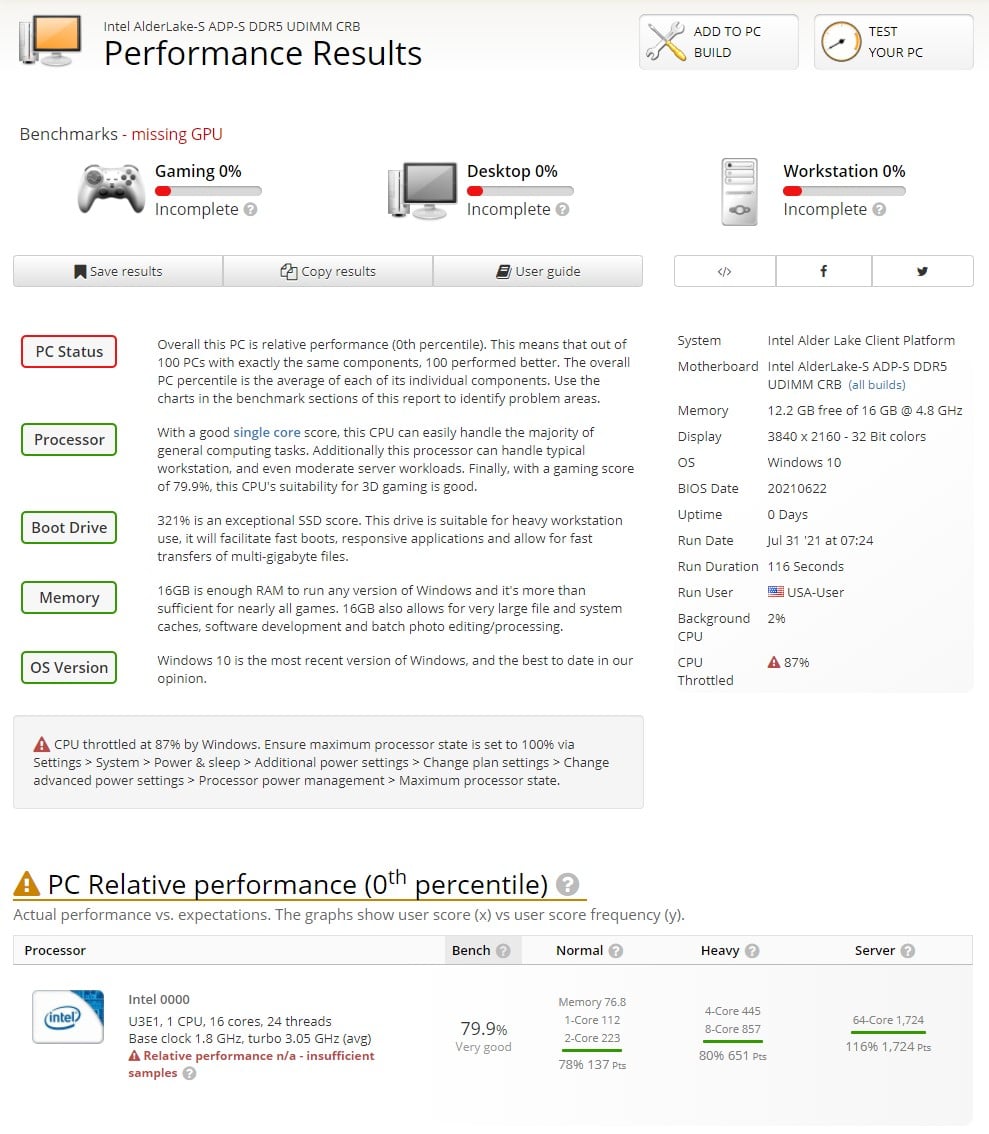 Patrząc na wspomniany test nieznanego układu, ten nie miał najlepiej. Jego taktowanie jest niskie, a test został przeprowadzony na Windowsie 10 z wykorzystaniem 16 GB pokładu pamięci DDR5-4800. Omawiany wpis w UserBenchmark opisuje 16-rdzeniowy i 24-wątkowy procesor Intel Alder Lake-S, wskazując jego 30 MB pamięci podręcznej L3 i podział na 8 rdzeni Golden Cove, czyli tych wydajnych z HyperThreadingiem oraz 8 rdzeni Gracemont (energooszczędnych).