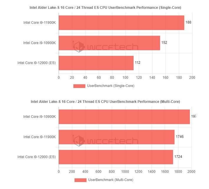 Serwis Wccftech postanowił porównać uzyskane przez tę próbkę inżynieryjną wyniki w UserBenchmark, wykazując, że jego wydajność jednordzeniowa nie dorównuje nawet Core i9-10900K (112 vs 152 punktów), ale to nic dziwnego, zważywszy na tak niskie taktowanie. Z kolei w operacjach wielowątkowych sprawa miała się już znacznie lepiej. Wcześniej nieoficjalne wyniki wskazywały, że domniemany Core i9-12900K przewyższy 16-rdzeniowy procesor AMD Ryzen 9 5950X pod kątem wydajności