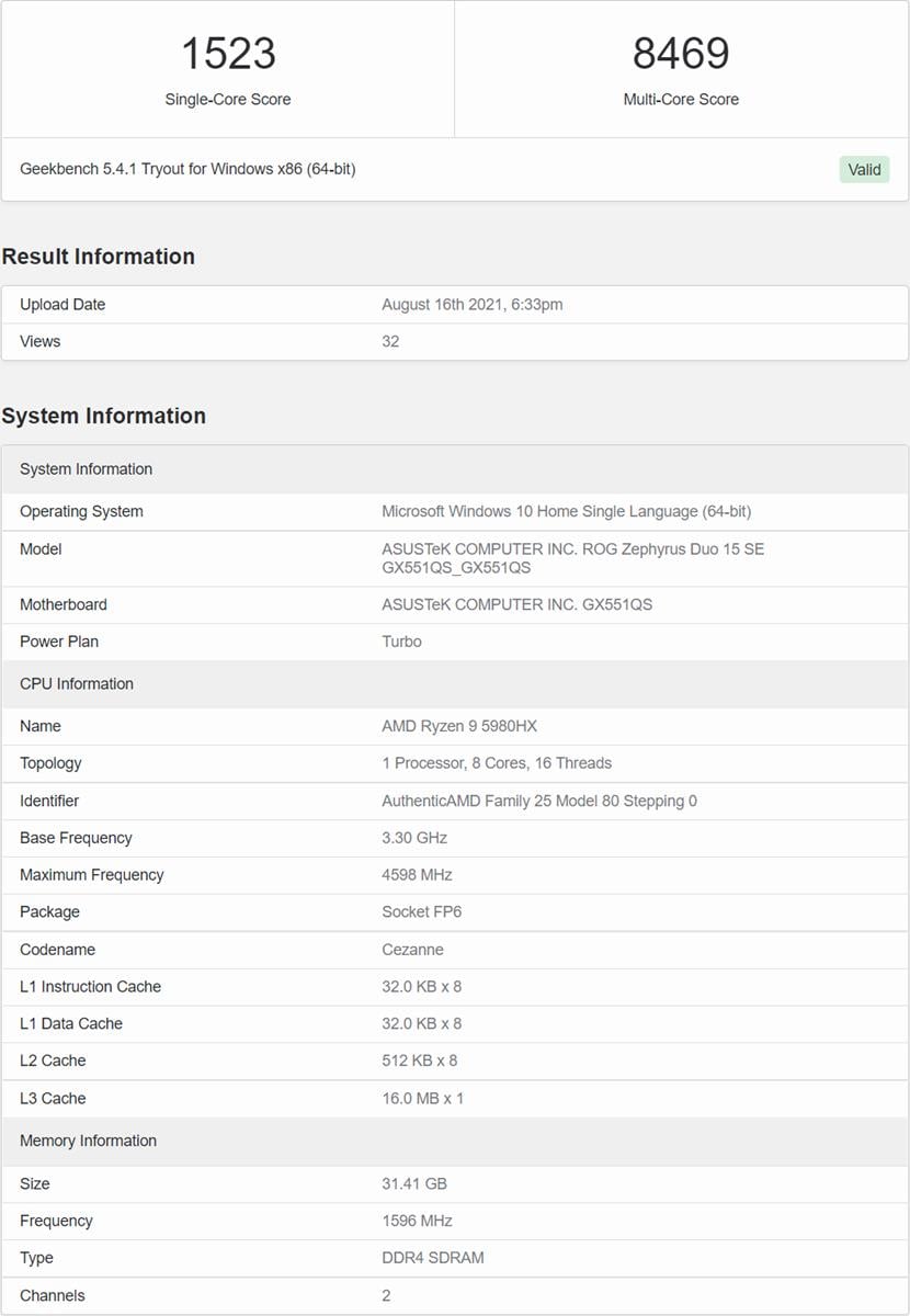 Ryzen 9 5980HX jest bezpośrednio związany z nieoficjalnym jeszcze laptopem ASUS ROG Zephyrus 15 Duo SE z górnej półki, na którego temat firma nie ujawniła jeszcze nic, a nic. Ten model jednak powstaje i to na pewno, bo to drugi już egzemplarz, który wyciekł do sieci, co wiemy z porównania nazwy kodowej. Z Geekbench możemy dodatkowo wyciągnąć, że ten laptop miał na pokładzie 32 GB pamięci DDR4-3200 i kartę graficzną GeForce RTX 3080.