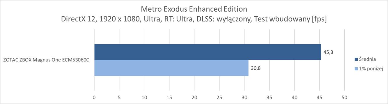 Testy wykonałem zgodnie z opisem zawartym w tym artykule. Zmieniałem jedynie ustawienia RT i DLSS, które opisałem na wykresach. W przypadku Metra pozostawiłem predefiniowane ustawienia Ultra, ale zmieniłem ray tracing na Ultra oraz Reflections na Raytraced. Wykresy z wynikami średnimi poniżej 20 fps zostały pominięte.