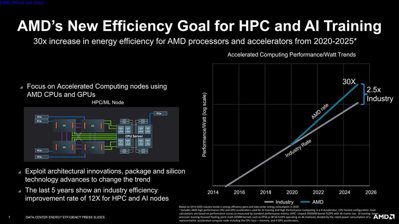 Cel efektywności energetycznej wyznaczony przez AMD dla przyspieszonych węzłów obliczeniowych wykorzystywanych do szkolenia SI i obliczeń o wysokiej wydajności w pełni odzwierciedla nowoczesne obciążenia, reprezentatywne zachowania operacyjne i dokładną metodologię testów porównawczych.— Dr Jonathan Koomey, prezes Koomey Analytics