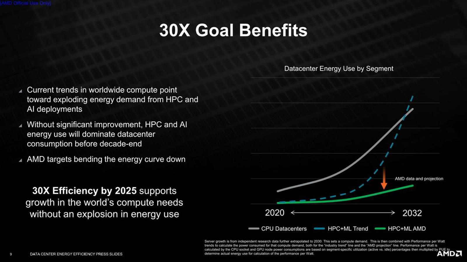 Wedle najnowszego ogłoszenia, AMD ma na celu osiągnięcie trzydziestokrotnie większej wydajności energetycznej dla swoich procesorów EPYC i akceleratorów Instinct. Firma ma to osiągnąć w 2025 roku, wyprzedzając znacząco konkurencję, bo 2,5-krotnie. To z kolei oznacza, że AMD stoi przed zadaniem zwiększenia wydajności energetycznej swoich produktów (poprzez niższe procesy technologiczne i nowe architektury) o 150%, względem standardu ustalonego przez branżę w ciągu ostatnich pięciu lat.