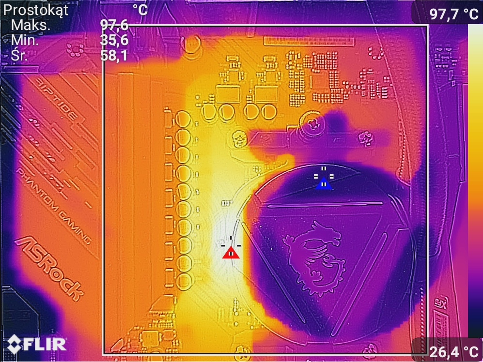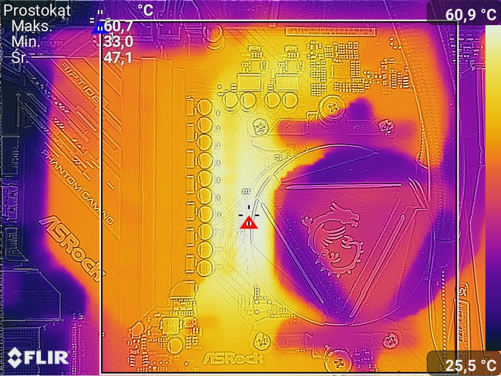 Testy przeprowadziłem przy wykorzystaniu wielowątkowego testu Cinebench R23, który działał 15 minut. Poniżej możecie zobaczyć zdjęcia termowizyjne wykonane dzięki smartfonowi CAT S61. Temperatury sprawdziłem przed OC oraz po podkręceniu procesora do 4,4 GHz.