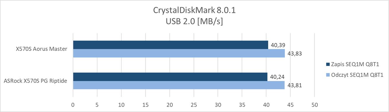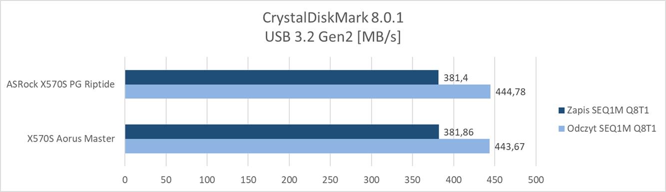 CrystalDiskMark pozwala na ocenienie wydajności dysków podłączonych do różnych złączy. Sprawdziłem tutaj działanie Adata SU650 120 GB podłączonego przez stację dokującą do dostępnych złączy USB oraz SATA. W przypadku M.2 mowa jest o dysku systemowym Samsung 970 Evo 1 TB. Tutaj warto zwrócić uwagę na samą temperaturę dysku ukrytego pod radiatorem. Pod obciążeniem zanotowałem 68°C i 90°C (dysk ma dwa czujniki). Jest to temperatura dosyć podobna do innych płyt, które mają takiej samej konstrukcji radiatory.