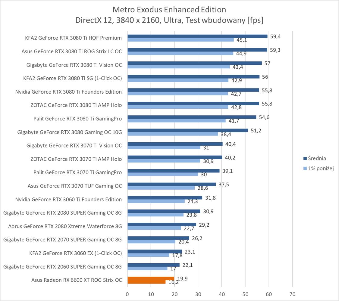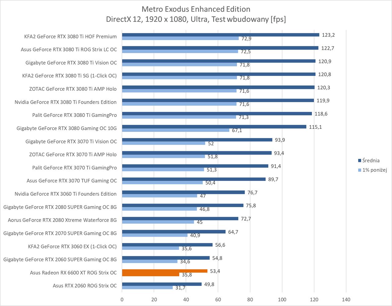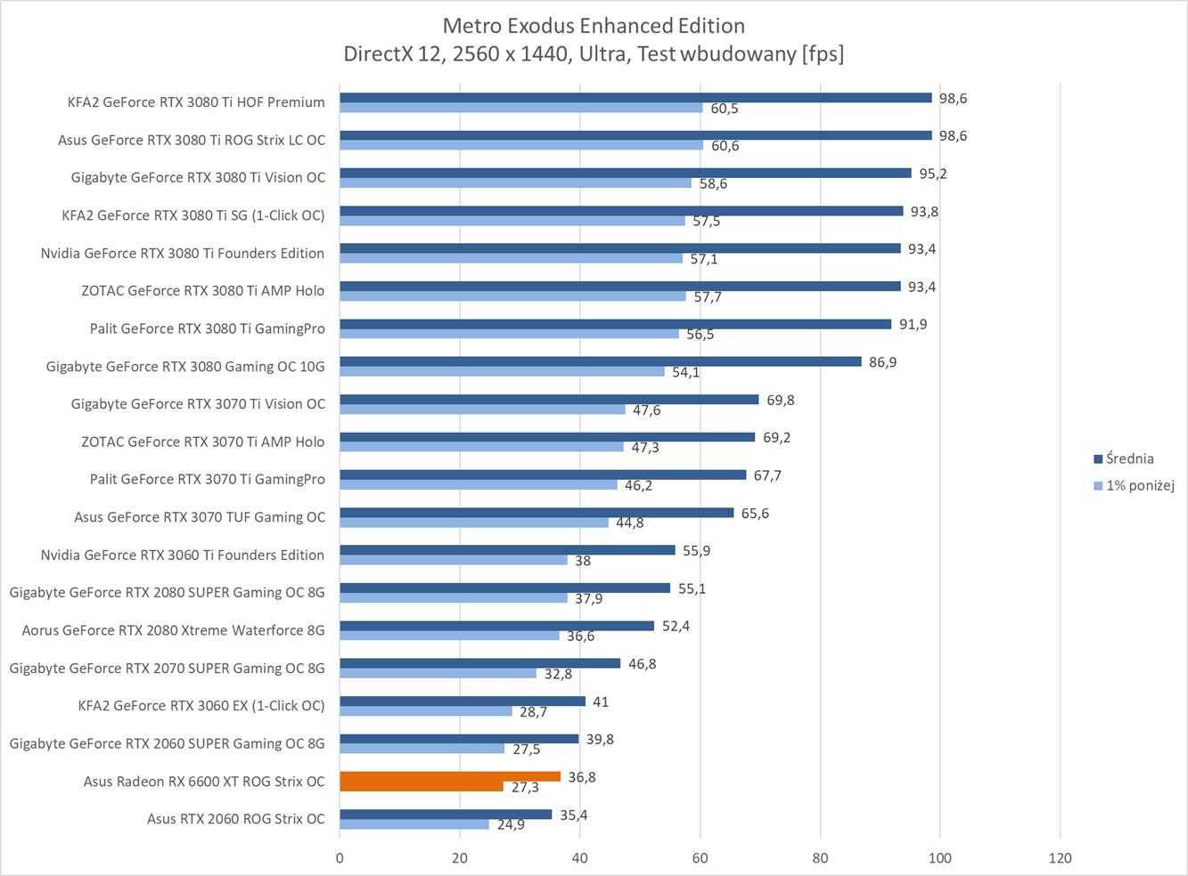 Taktowanie boost wynosi 2607 MHz, natomiast w benchmarku Metro Exodus Enhanced Edition 2560 x 1440 px karta miała średnie taktowanie wynoszące ok. 2535 MHz. Ponieważ jest to jedyna karta RX 6600 XT, jaką mam okazję testować, to nie mam jak porównać tego wyniku do konkurencji.