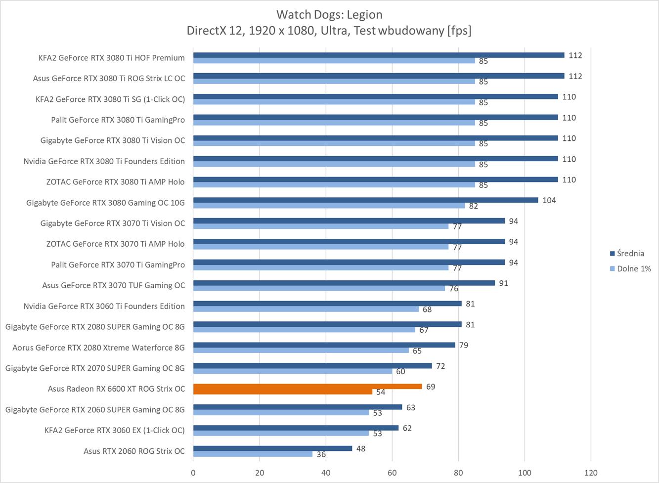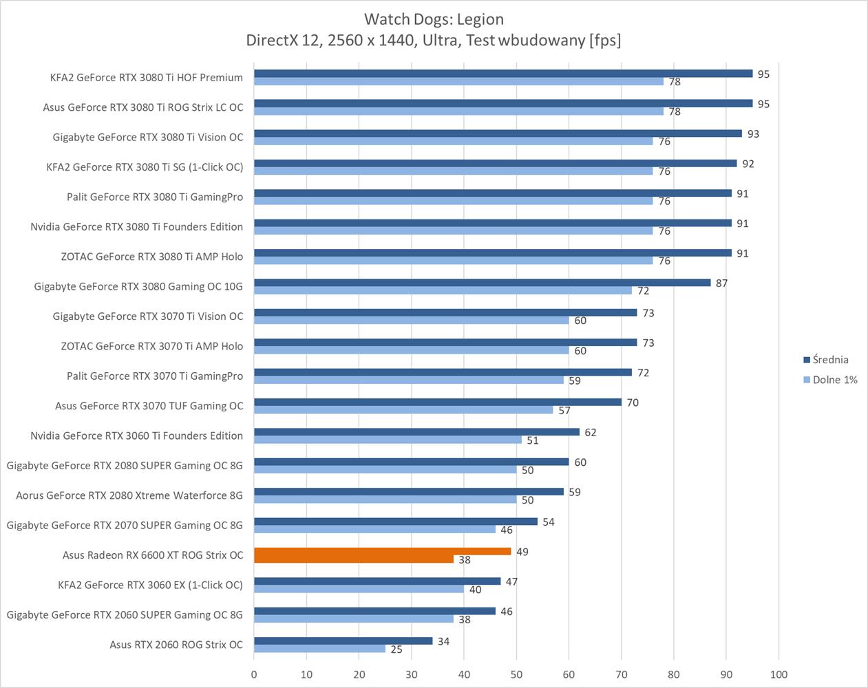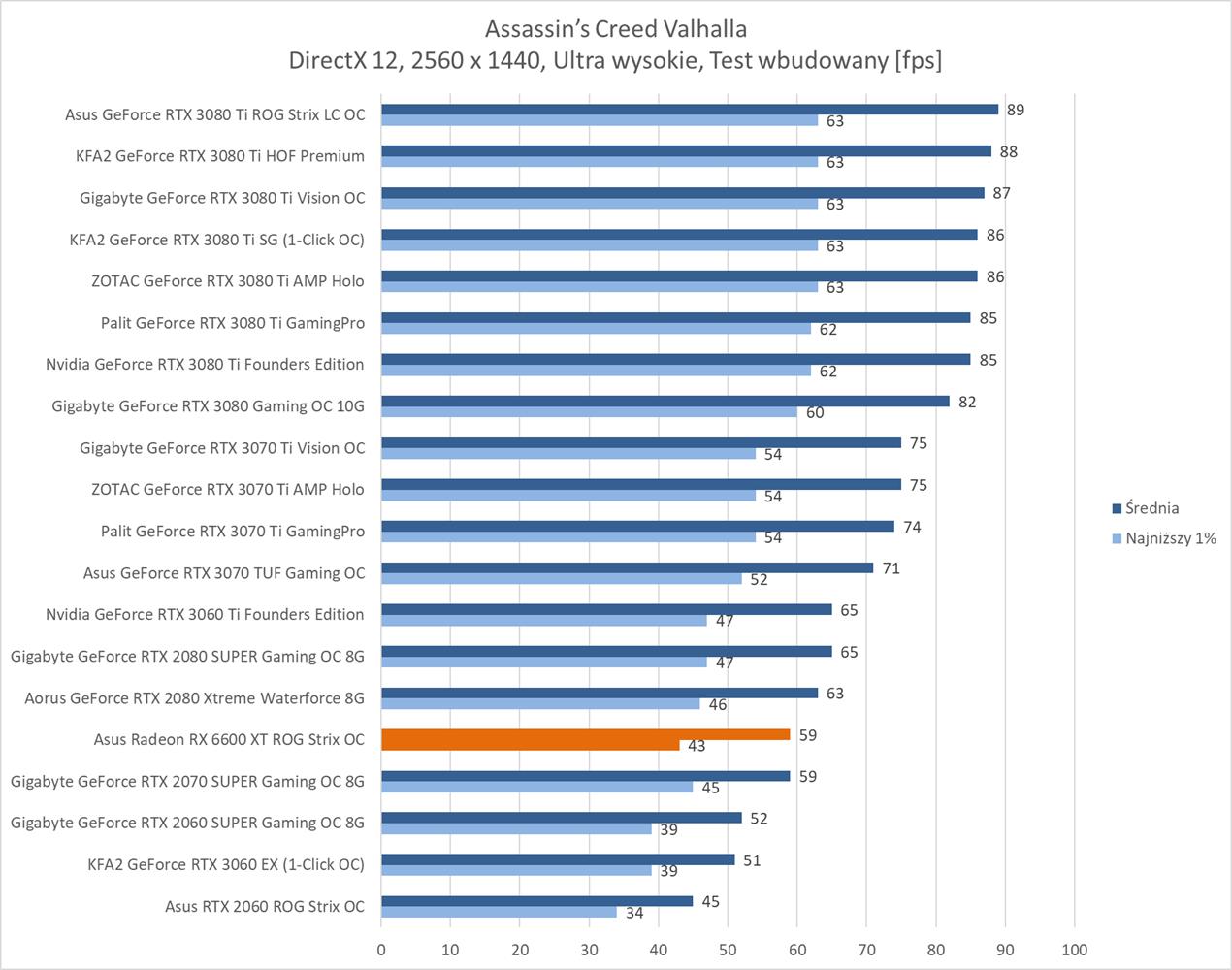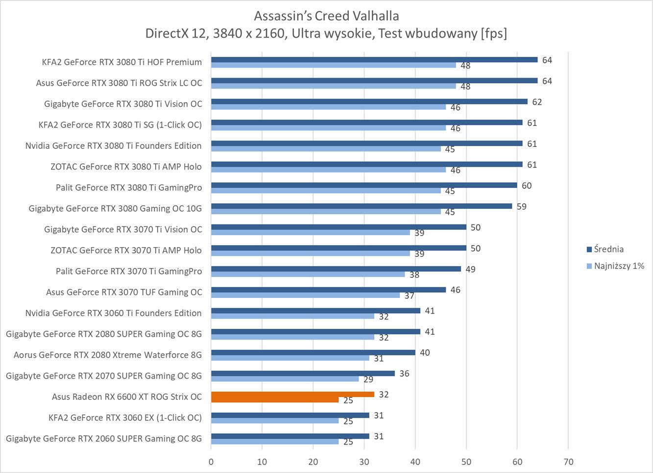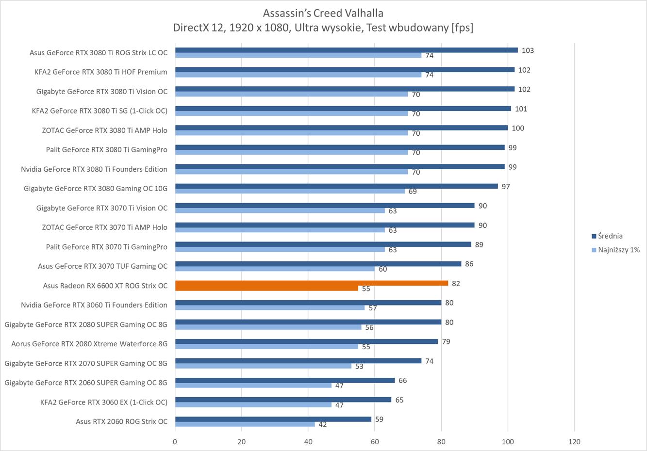 Już w pierwszej z rozdzielczości widać, że Asus Radeon RX 6600 XT ROG Strix OC nie we wszystkich tytułach notuje średnio 60 fps. W większości gier bardziej konkuruje ona z RTX 3060, niż RTX 3060 Ti, co ma spore znaczenie w kontekście sugerowanej ceny. Są oczywiście wyjątki – np. Assassin’s Creed Valhalla.