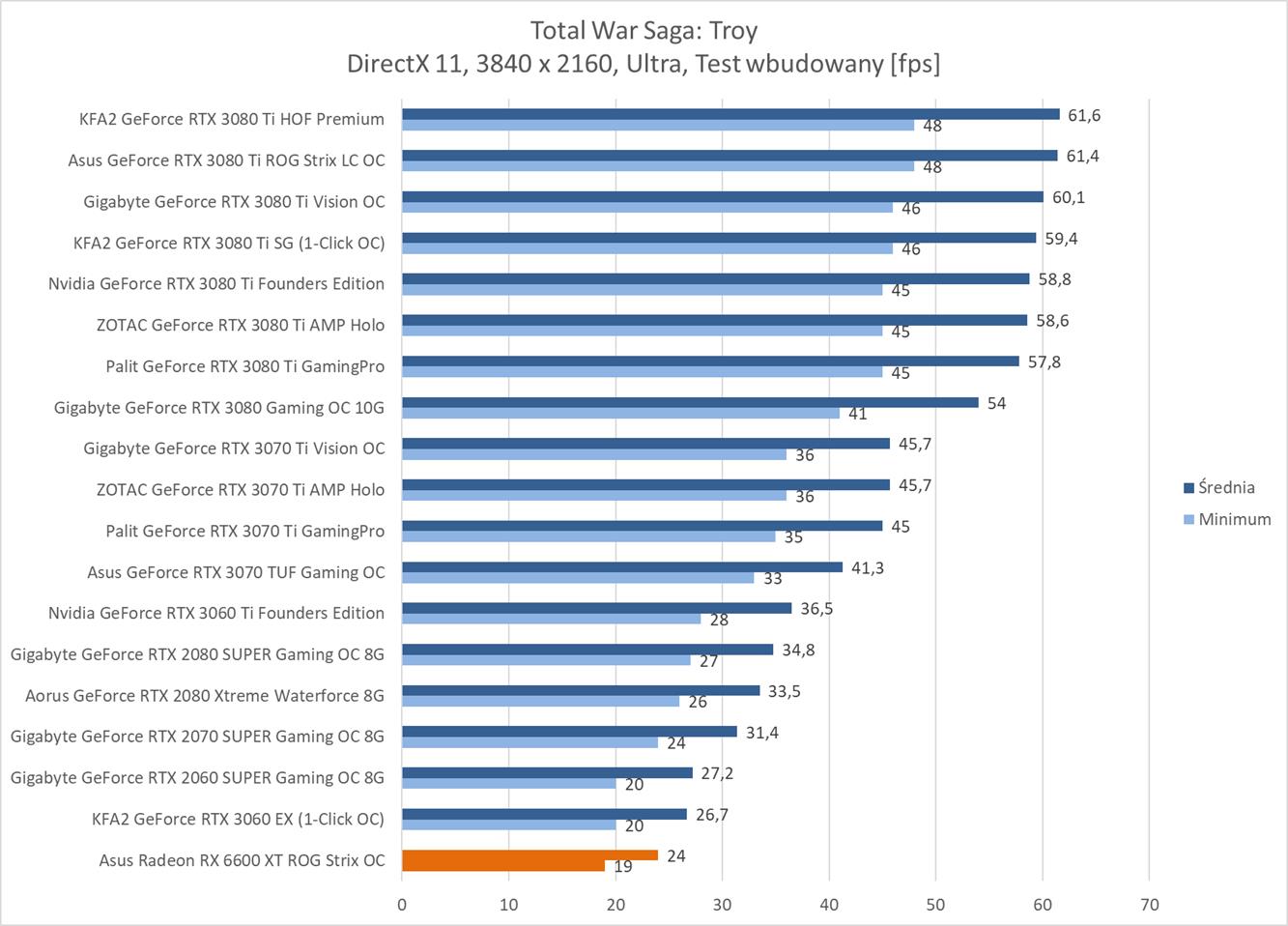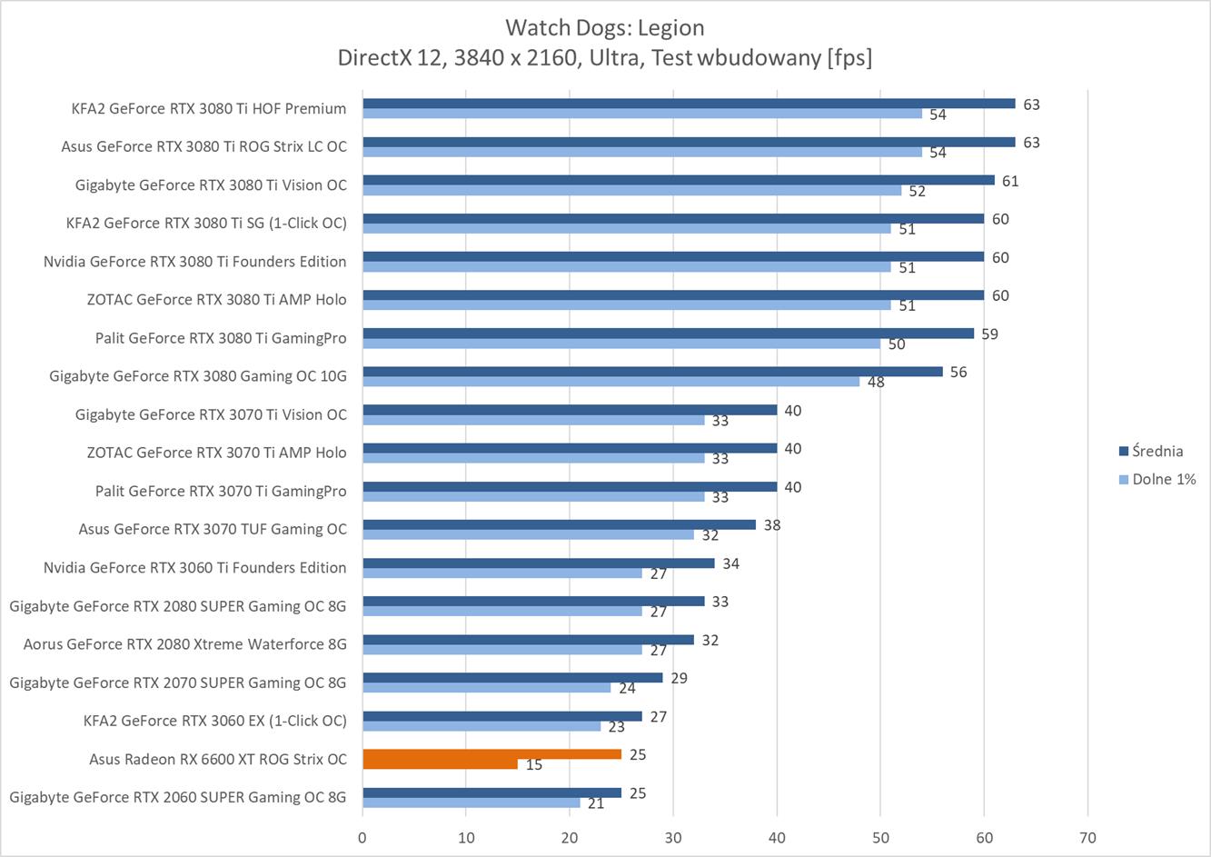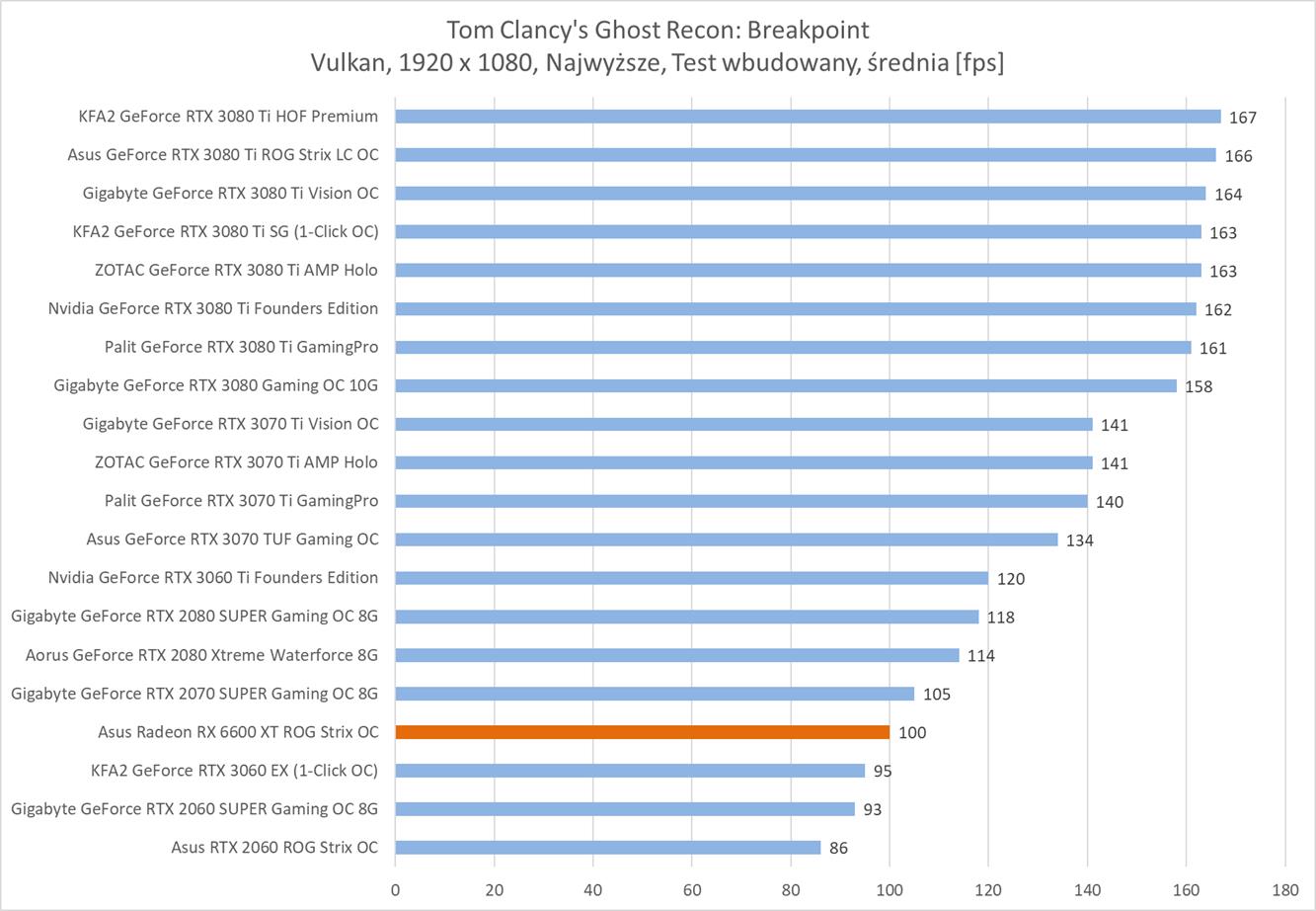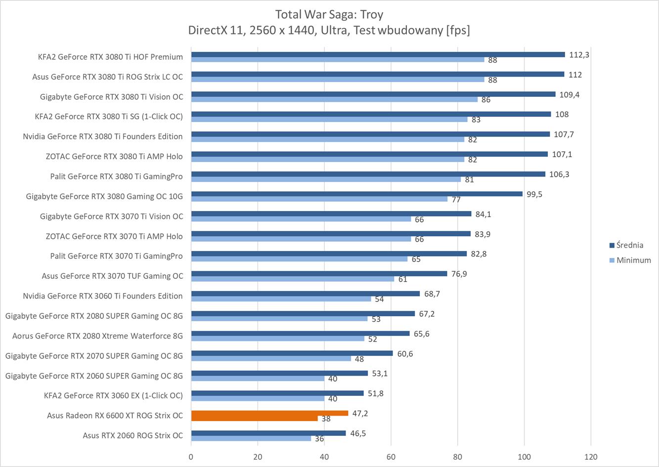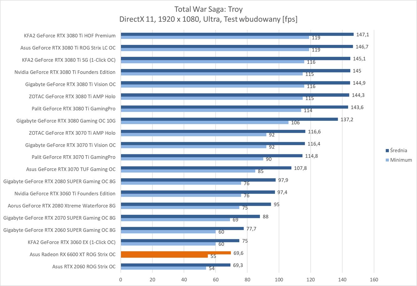 Już w pierwszej z rozdzielczości widać, że Asus Radeon RX 6600 XT ROG Strix OC nie we wszystkich tytułach notuje średnio 60 fps. W większości gier bardziej konkuruje ona z RTX 3060, niż RTX 3060 Ti, co ma spore znaczenie w kontekście sugerowanej ceny. Są oczywiście wyjątki – np. Assassin’s Creed Valhalla.