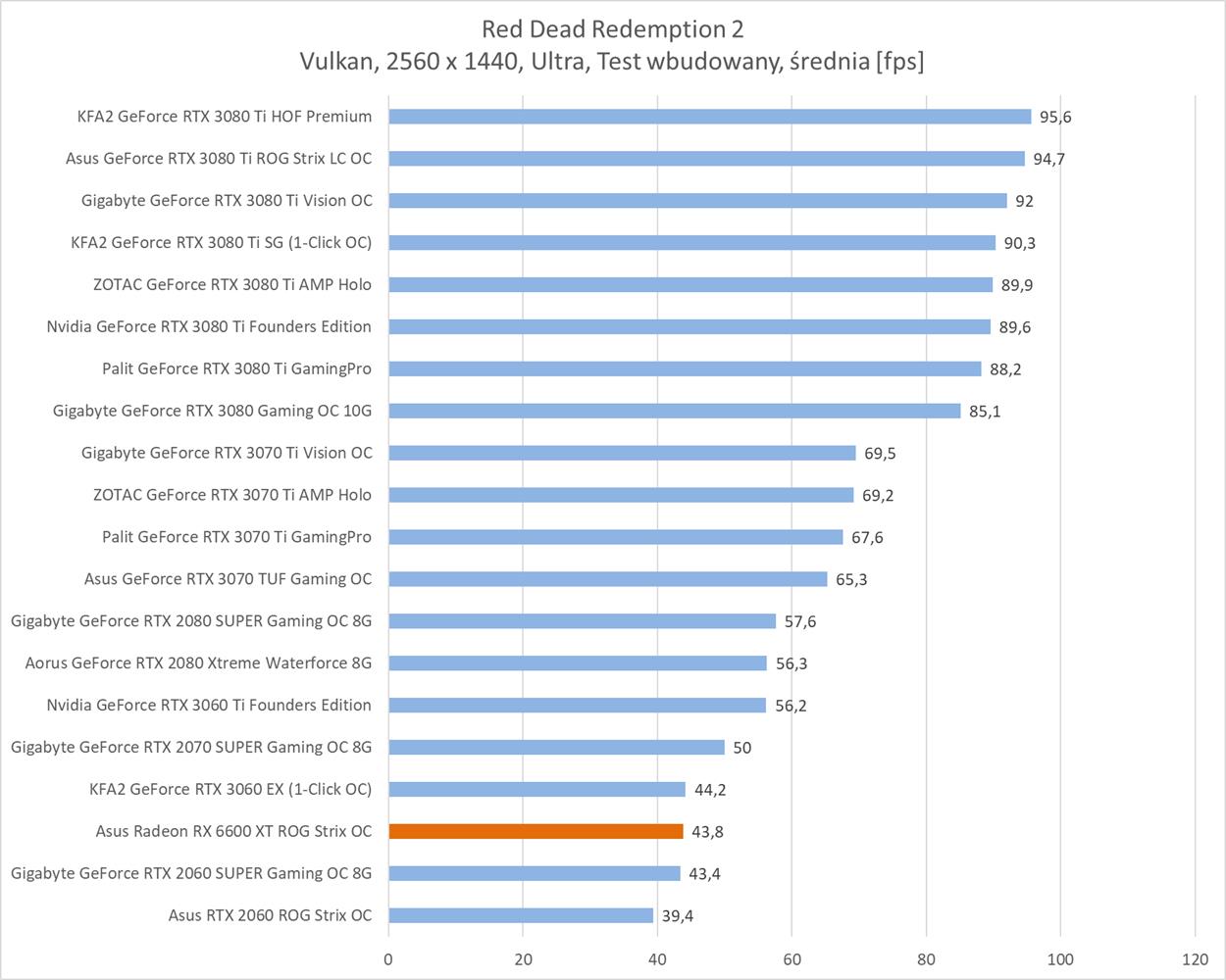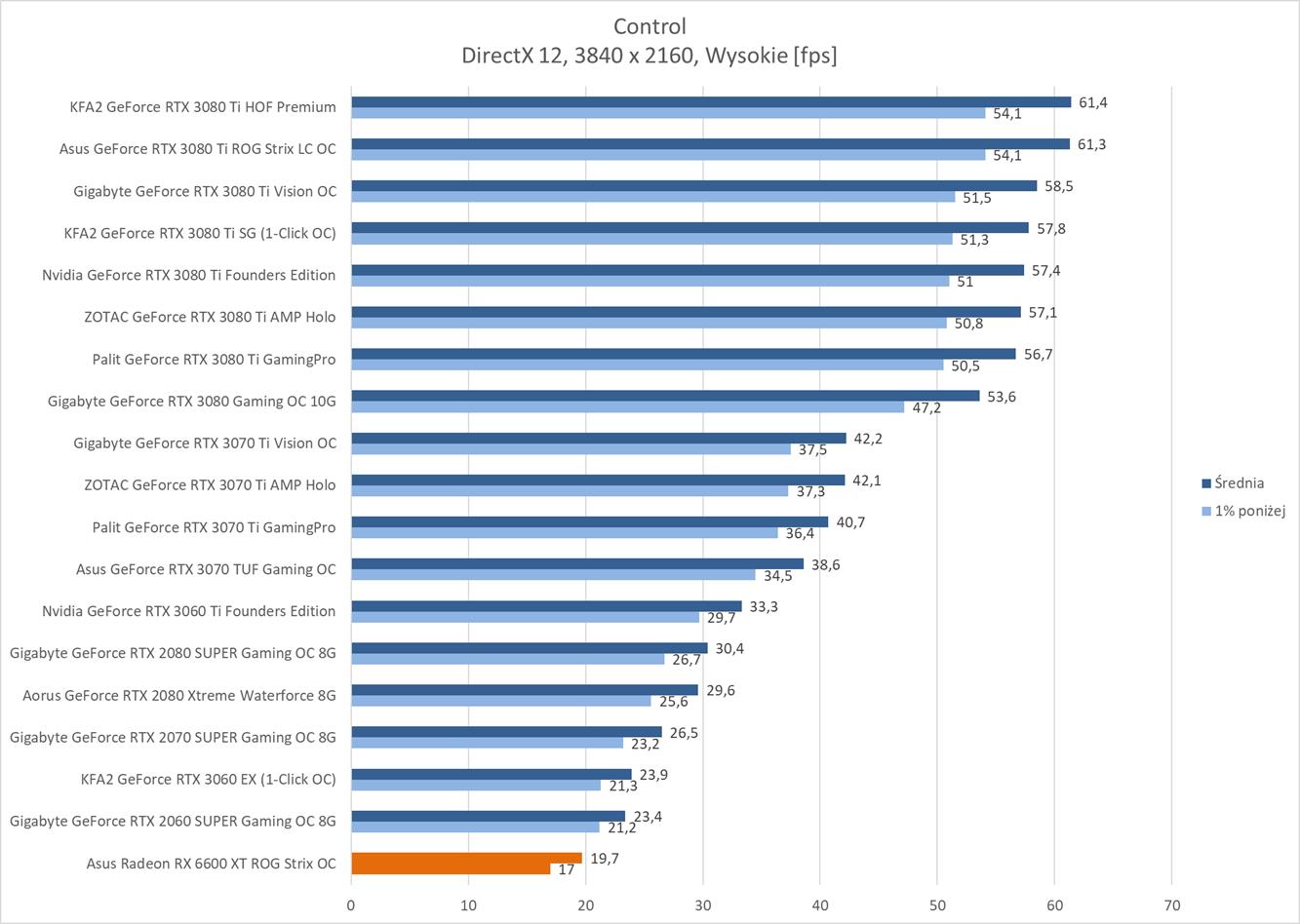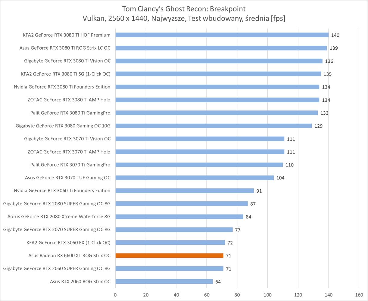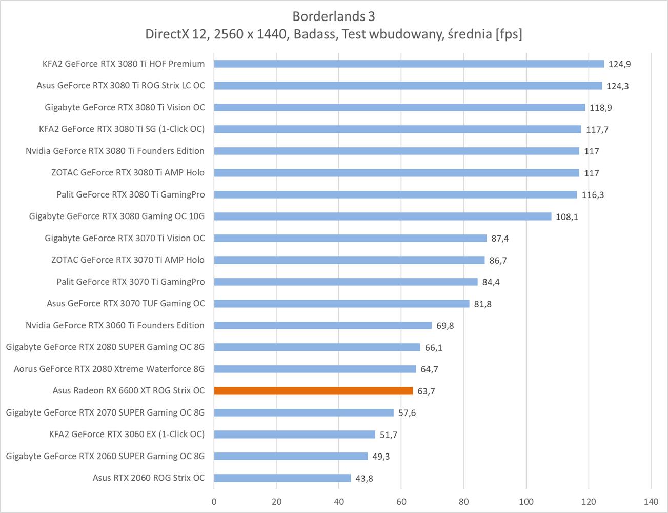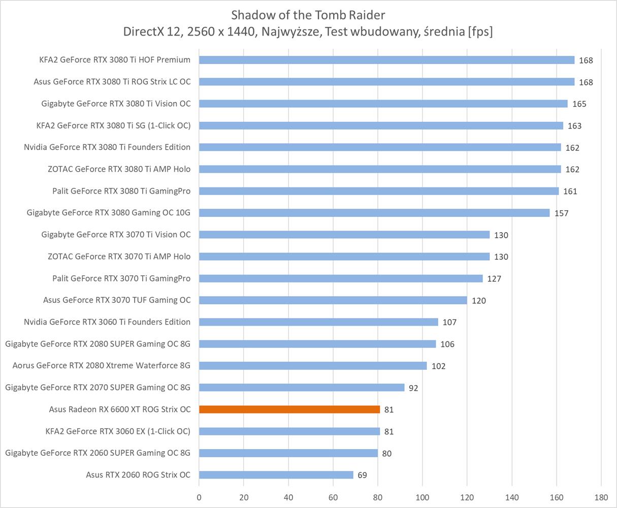 W kolejnej z rozdzielczości karta jeszcze bardziej zbliża się do RTX 3060. Niestety tutaj wyniki w większości tytułów są niższe niż 60 fps, więc konieczne będzie obniżenie detali w celu uzyskania w pełni płynnej rozgrywki.