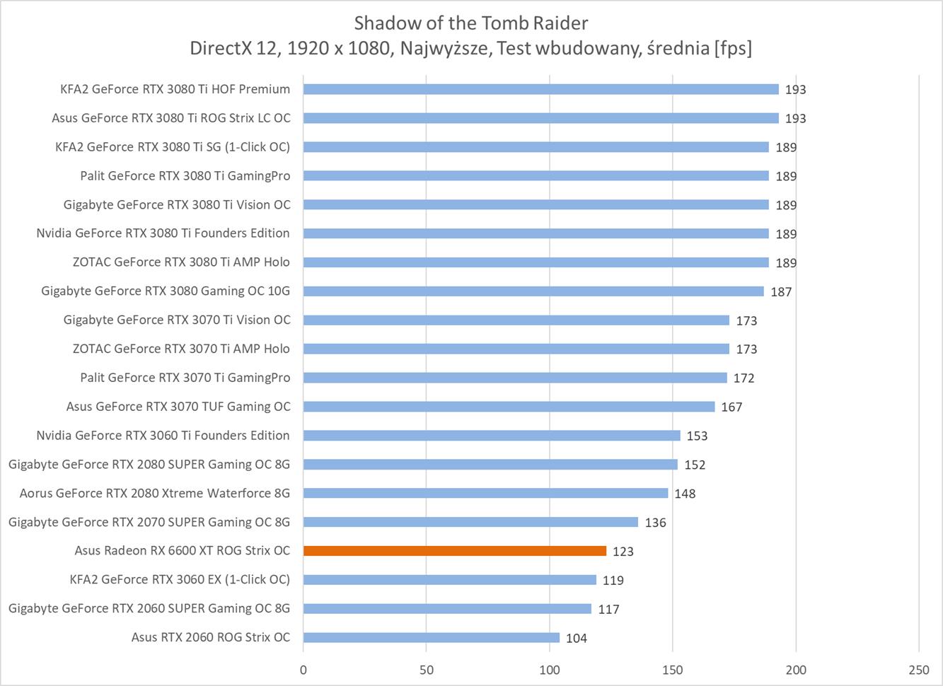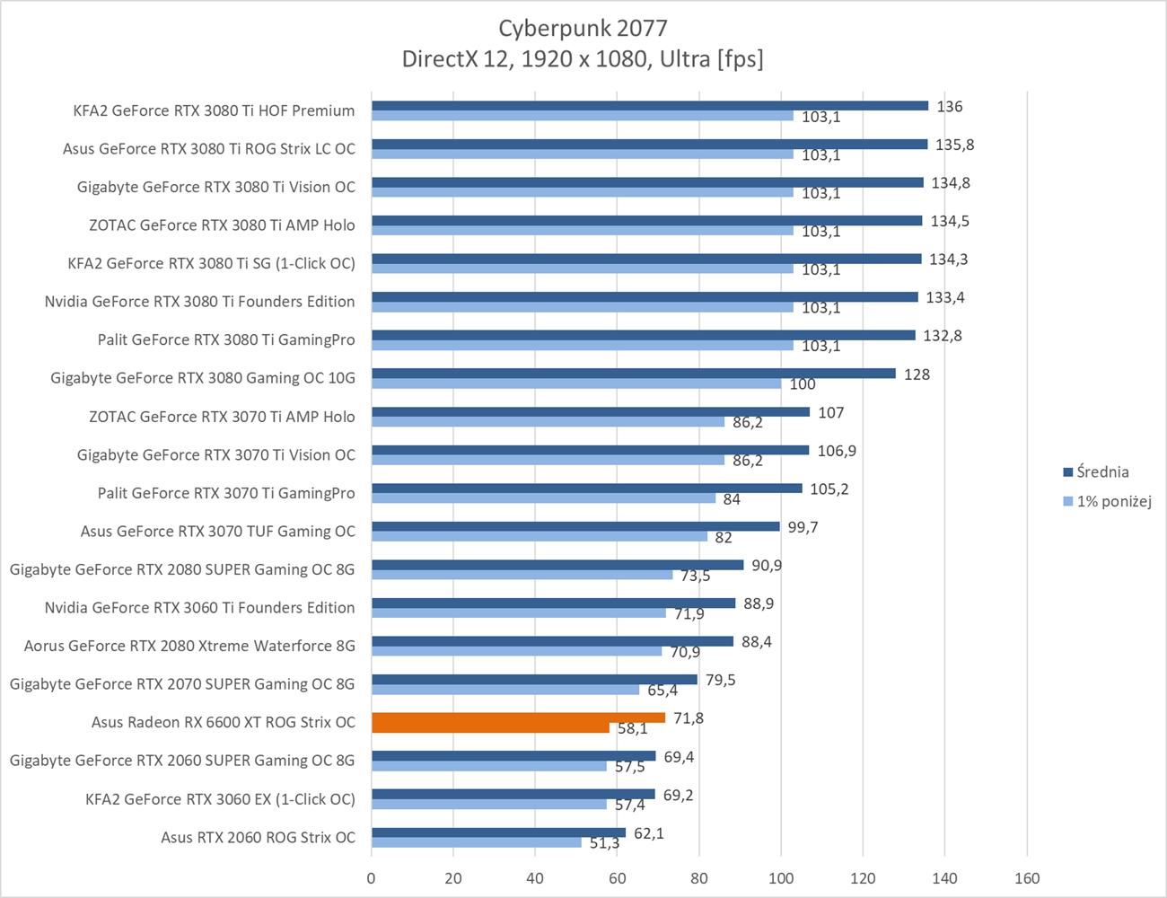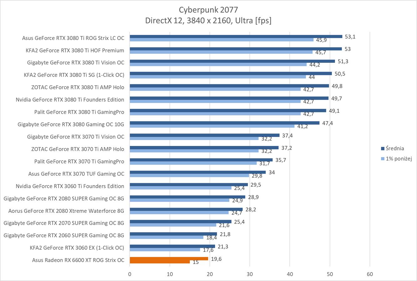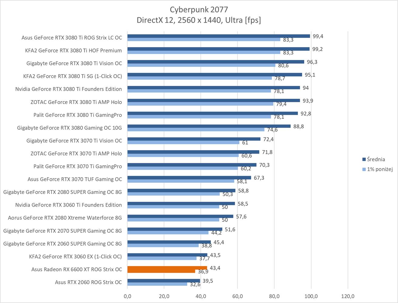 Niestety praktyka jest inna, a ceny w sklepach znacznie wyższe od sugerowanych. W momencie pisania tekstu znalazłem Asus Radeon RX 6600 XT ROG Strix OC za ok. 3220 zł, podczas gdy ceny RTX 3060 zaczynały się od ok. 3300 zł, a RTX 3060 Ti od ok. 3900 zł. W takim wypadku jeśli szukacie karty do Full HD to zdecydowanie warto rozważyć 6600 XT. Jest ona w tej rozdzielczości średnio wydajniejsza od RTX 3060, a przy podobnych cenach zakup zaczyna nabierać sensu. W rozdzielczości 2K karta również wypada średnio trochę lepiej od wspomnianej konkurencji, ale tutaj ciężko o 60 fps przy maksymalnych detalach.