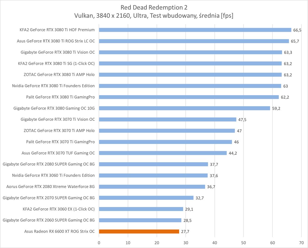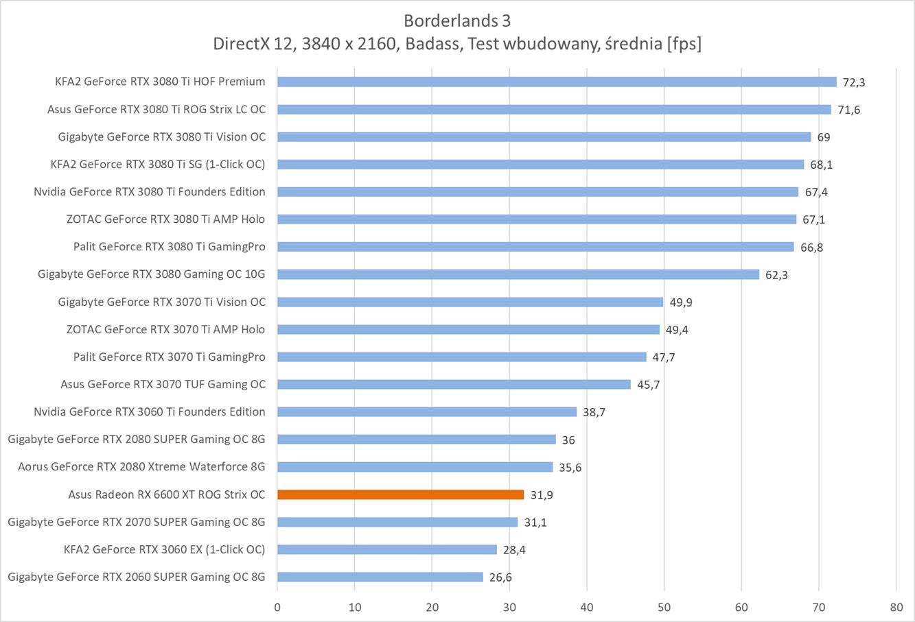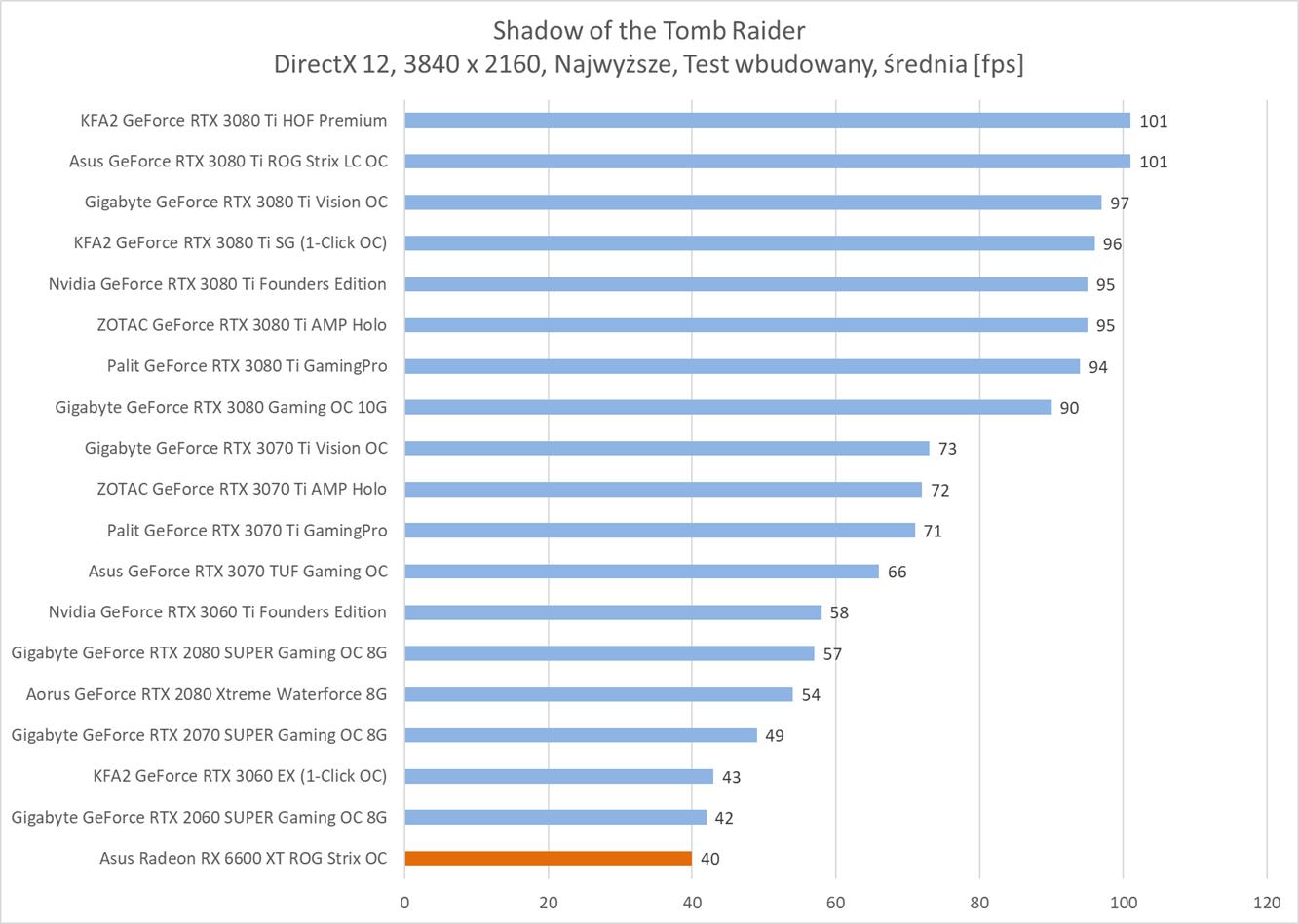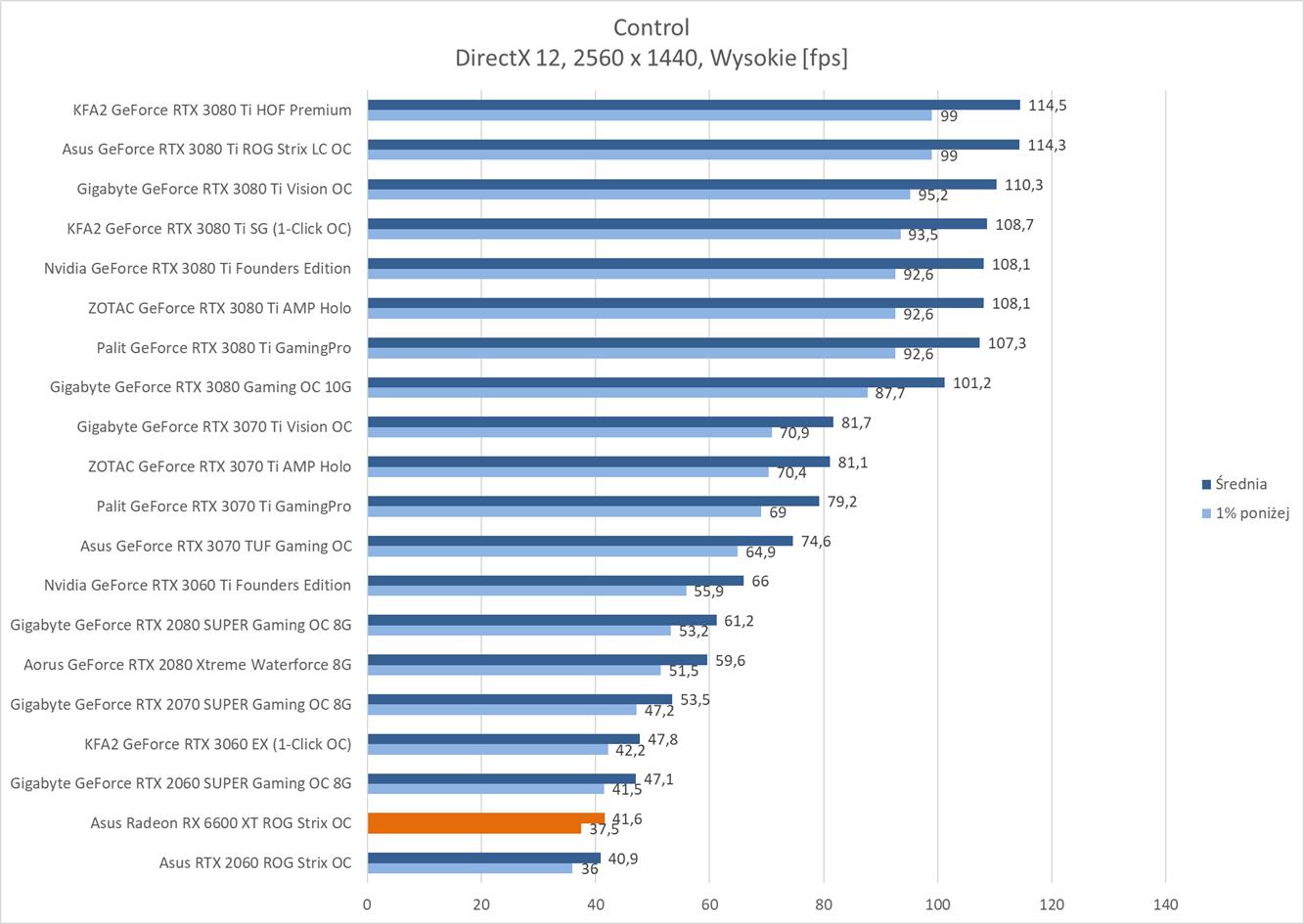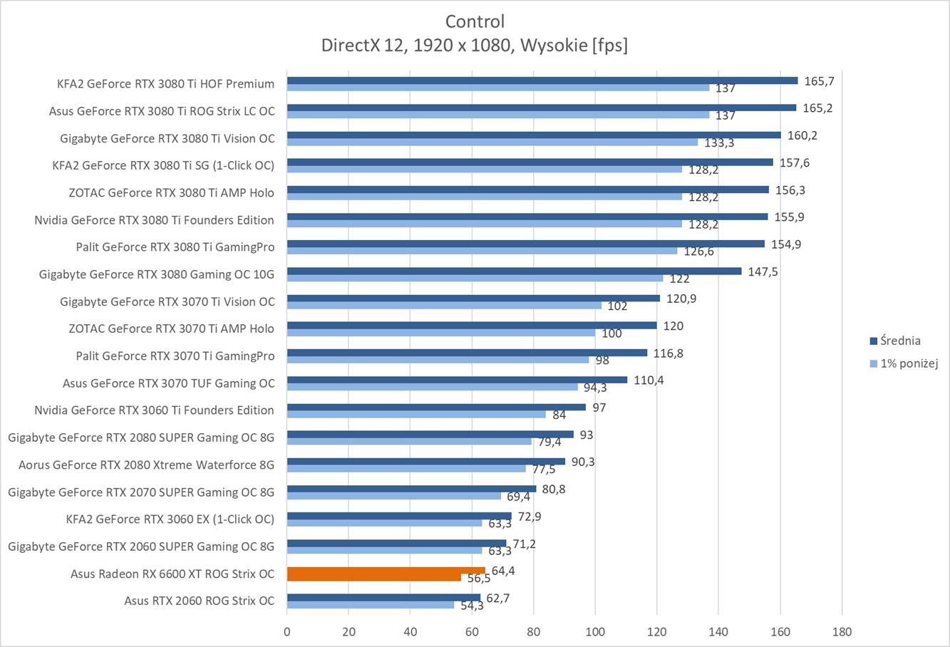 Niestety praktyka jest inna, a ceny w sklepach znacznie wyższe od sugerowanych. W momencie pisania tekstu znalazłem Asus Radeon RX 6600 XT ROG Strix OC za ok. 3220 zł, podczas gdy ceny RTX 3060 zaczynały się od ok. 3300 zł, a RTX 3060 Ti od ok. 3900 zł. W takim wypadku jeśli szukacie karty do Full HD to zdecydowanie warto rozważyć 6600 XT. Jest ona w tej rozdzielczości średnio wydajniejsza od RTX 3060, a przy podobnych cenach zakup zaczyna nabierać sensu. W rozdzielczości 2K karta również wypada średnio trochę lepiej od wspomnianej konkurencji, ale tutaj ciężko o 60 fps przy maksymalnych detalach.