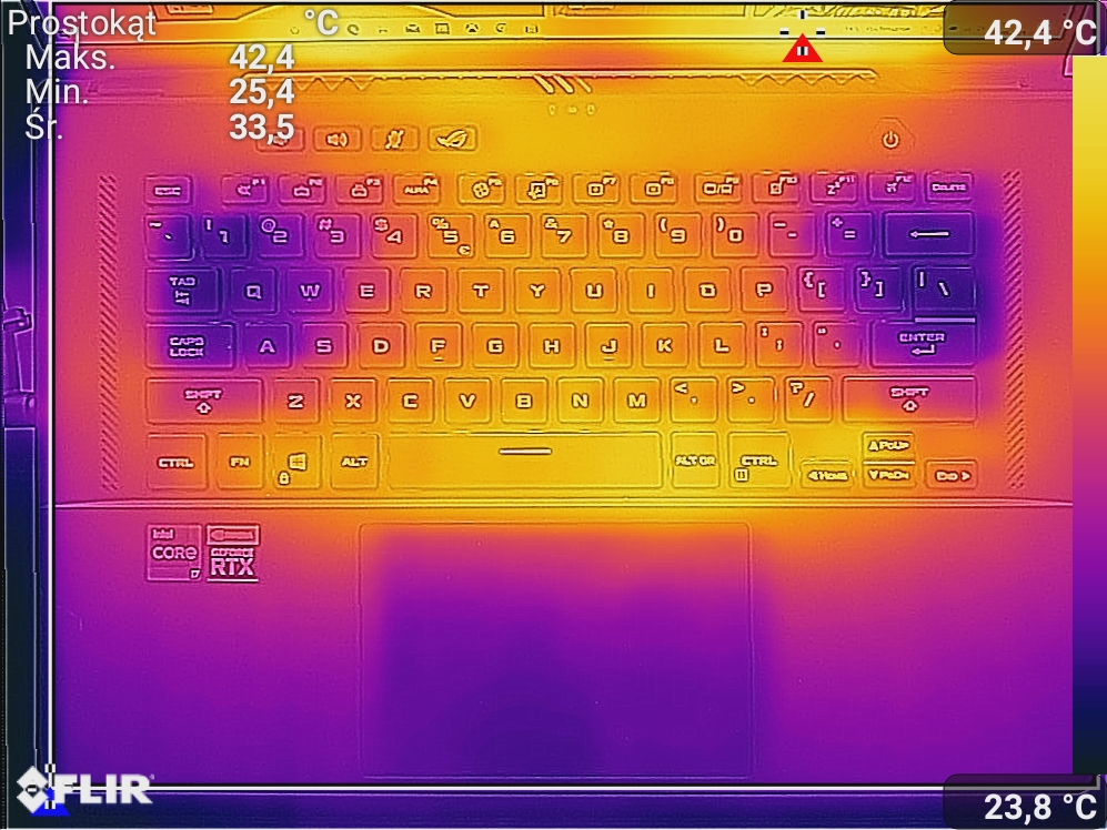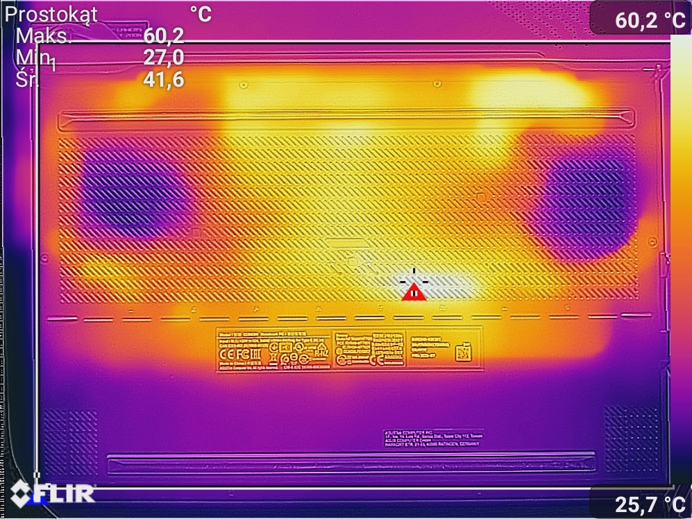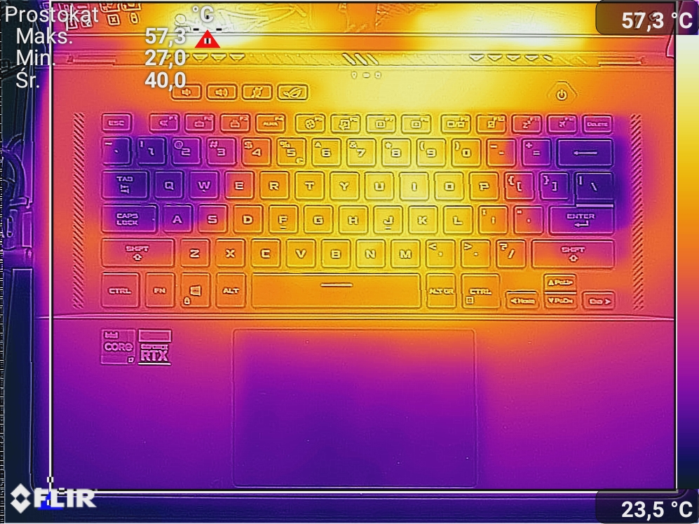 Spoczynek polegał na samym wyświetlonym pulpicie, włączonej przeglądarce, 100% jasności oraz połączeniu WiFi. Obciążenia dokonałem poprzez odpalenie gry Cyberpunk 2077 w maksymalnej dla ekranu rozdzielczości. Zdjęcia termowizyjne wykonałem przy wykorzystaniu smartfonu CAT S61.
