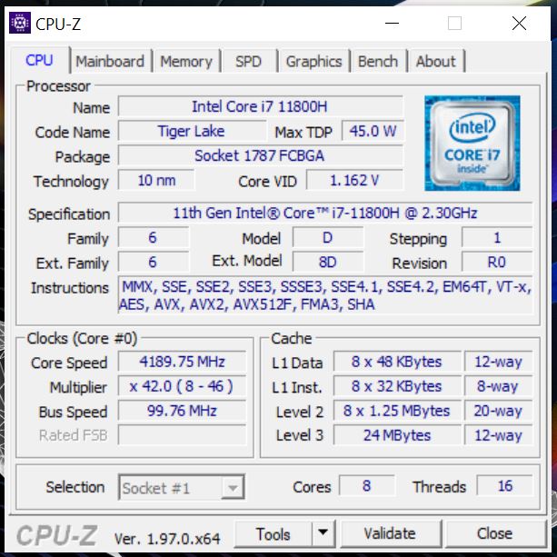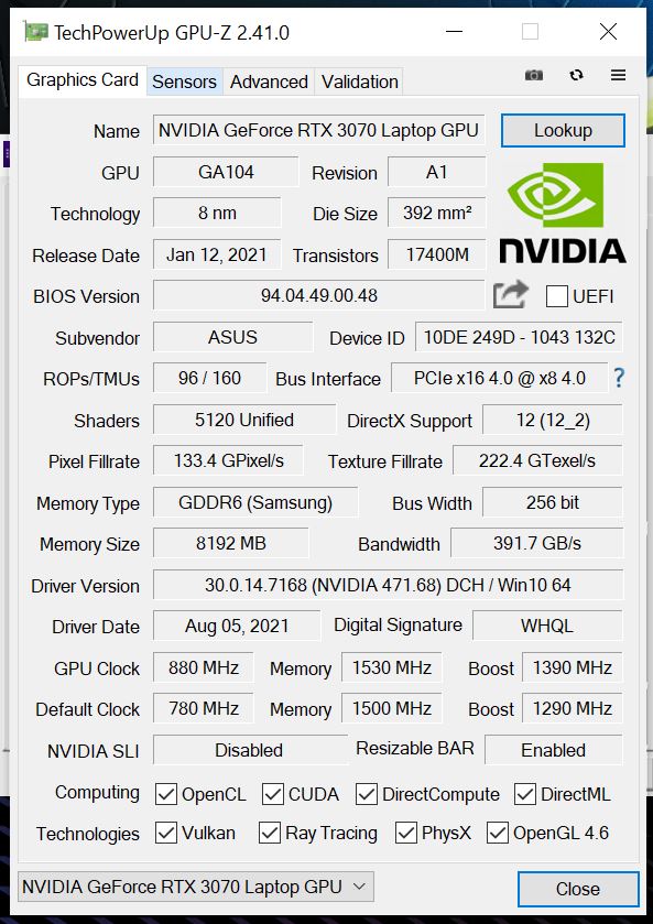 Laptop wyposażony jest w procesor Intel Core i7-11800H. Jest to konstrukcja 8-rdzeniowa i 16-wątkowa, której maksymalna częstotliwość turbo wynosi 4,60 GHz. Ilość pamięci RAM to 2x 16 GB o częstotliwości 3200 MHz. i opóźnieniach CL22. Karty graficzne jak zwykle są dwie. Pierwsza to zintegrowana Intel UHD, a druga dedykowana Nvidia GeForce RTX 3070 o TGP 80 W (100W z Dynamic Boost). Jej taktowanie boost wynosi 1390 MHz. Idąc dalej na pokładzie mamy też 1 TB dysk NVMe Samsunga (MZVL21T0HCLR-00B00). Jest to konstrukcja PCI-E Gen4, czyli możemy spodziewać się znakomitych wyników w testach. Z pozostałych rzeczy warto wspomnieć o obecności WiFi 6 oraz Bluetooth 5.2.